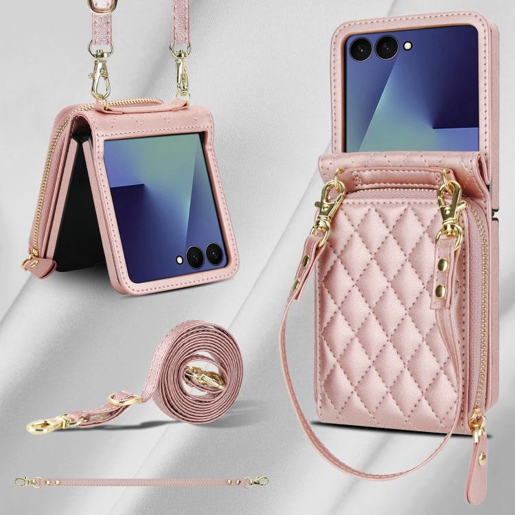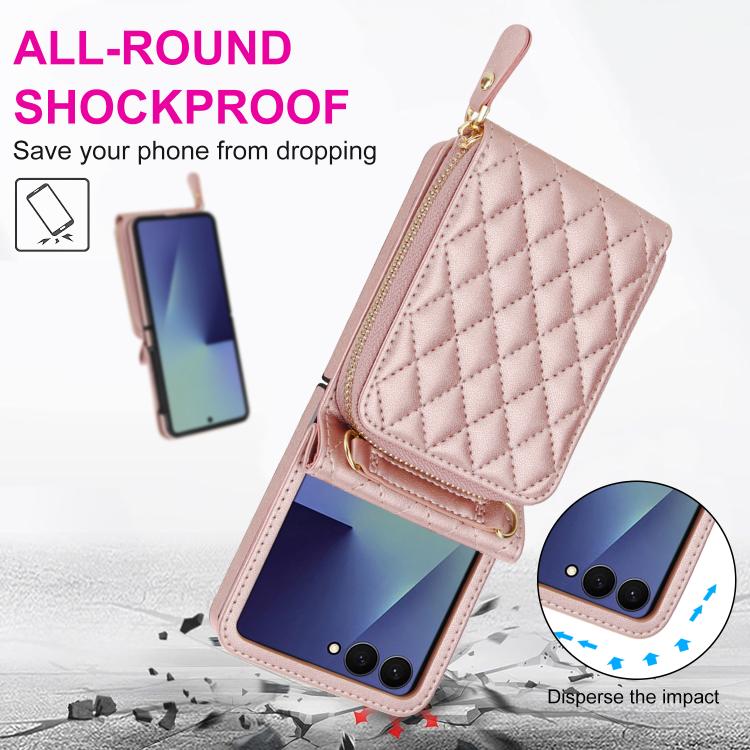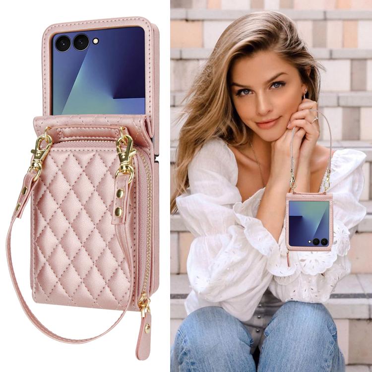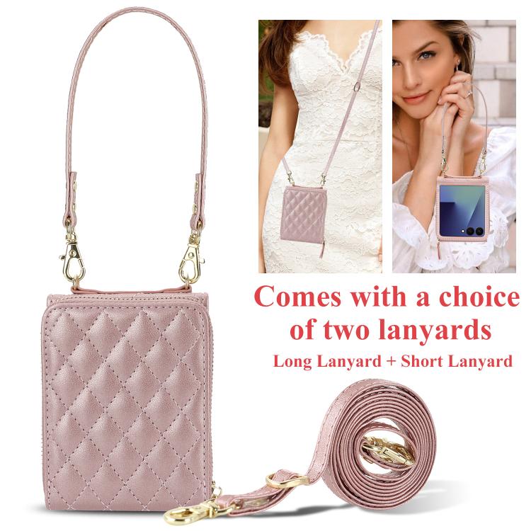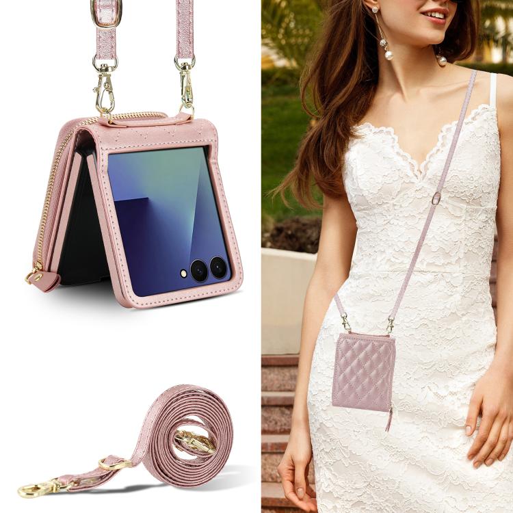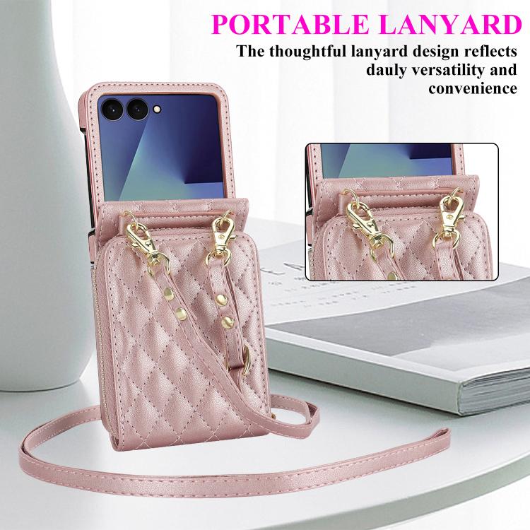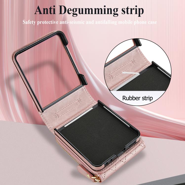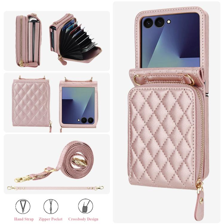 For Samsung Galaxy Z Flip7 5G Large Zipper Card Slot Leather Phone Case with Crossbody Strap(Rose Gold)