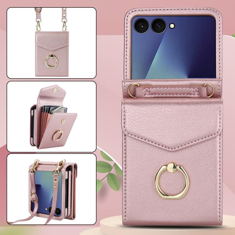 For Samsung Galaxy Z Flip7 5G Litchi Texture RFID Card Slot Phone Case with Ring Holder(Rose Gold)