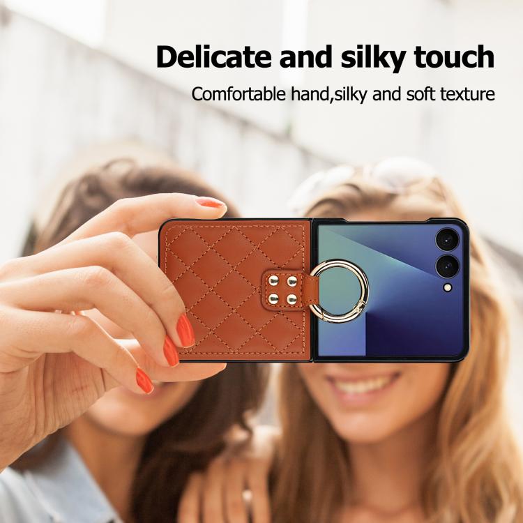 For Samsung Galaxy Z Flip7 5G Rhombic Texture Ring Holder PU Phone Case(Brown)