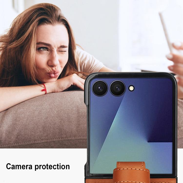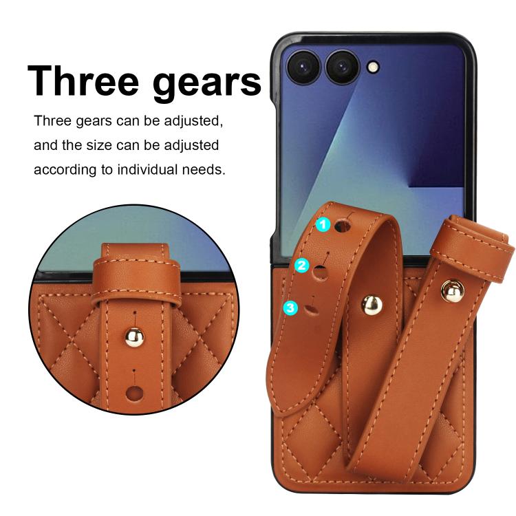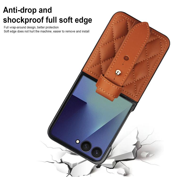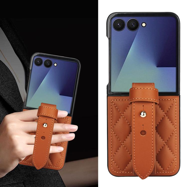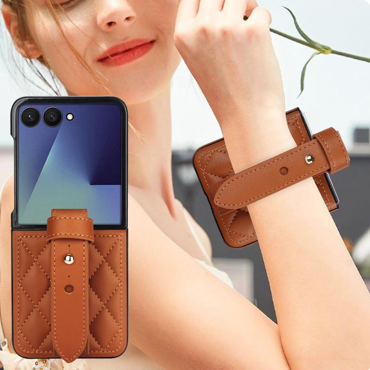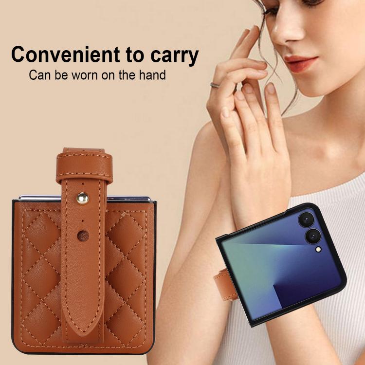 For Samsung Galaxy Z Flip7 5G Rhombic Texture Wristband PU Phone Case(Brown)