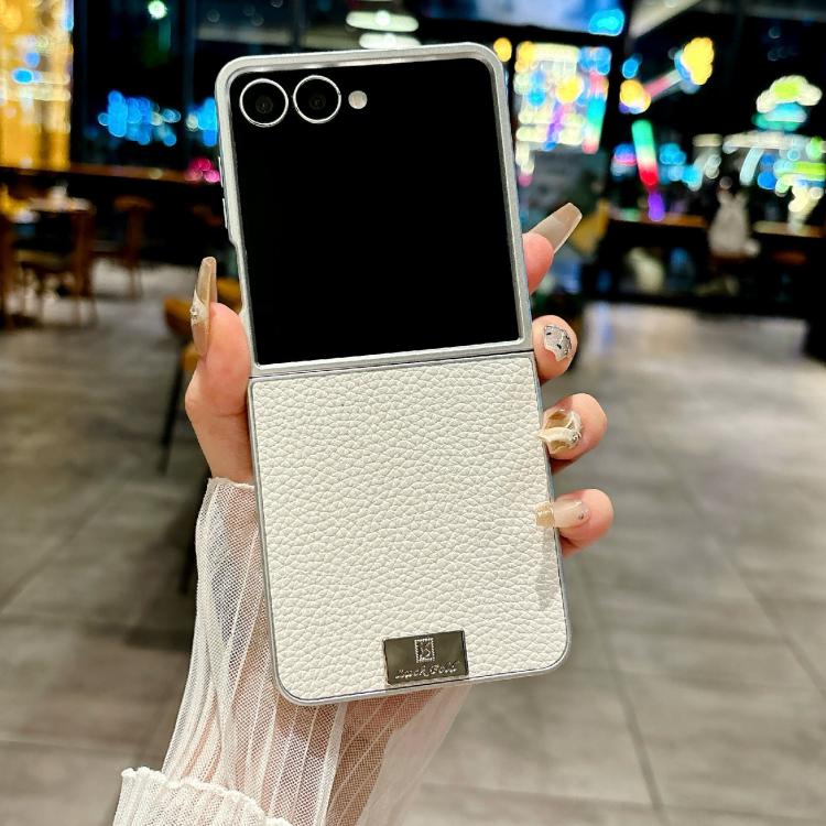 For Samsung Galaxy Z Flip7 5G Silver Frame Litchi Texture Nameplate Full Coverage Phone Case(White)