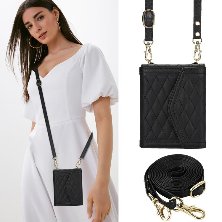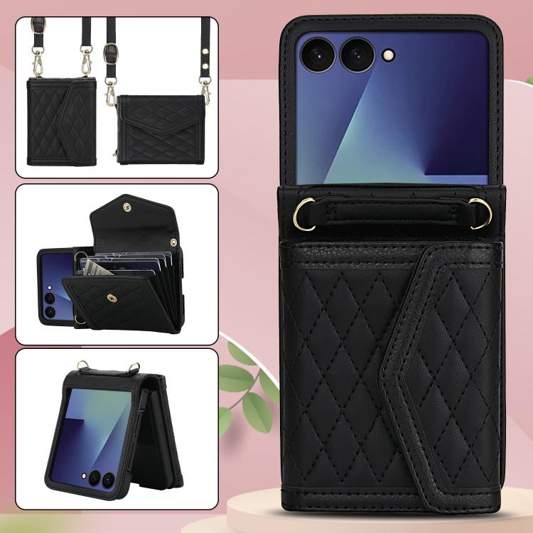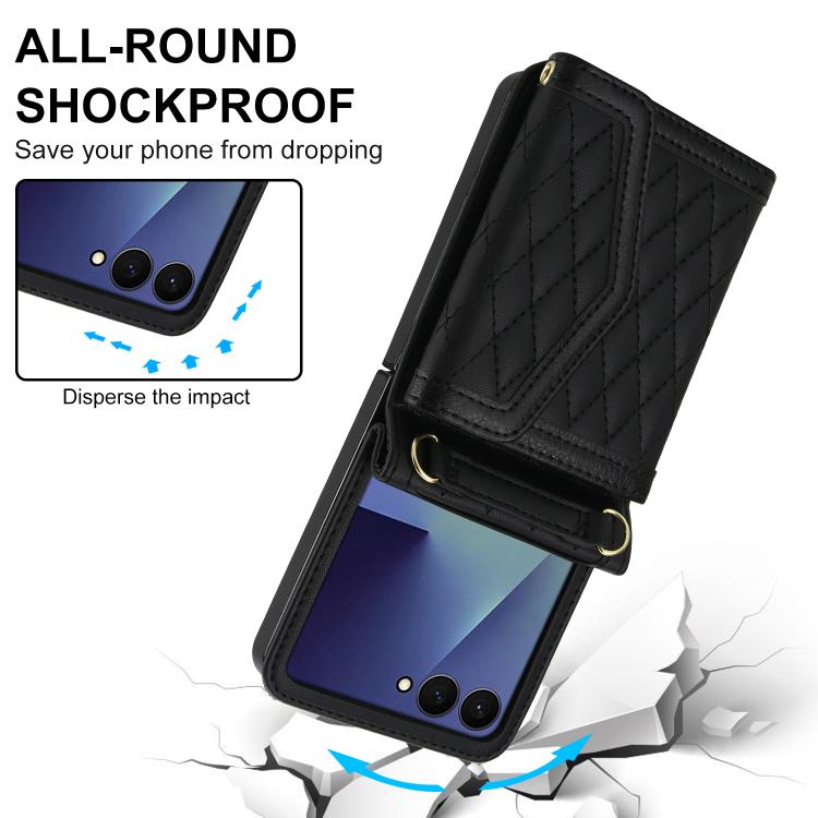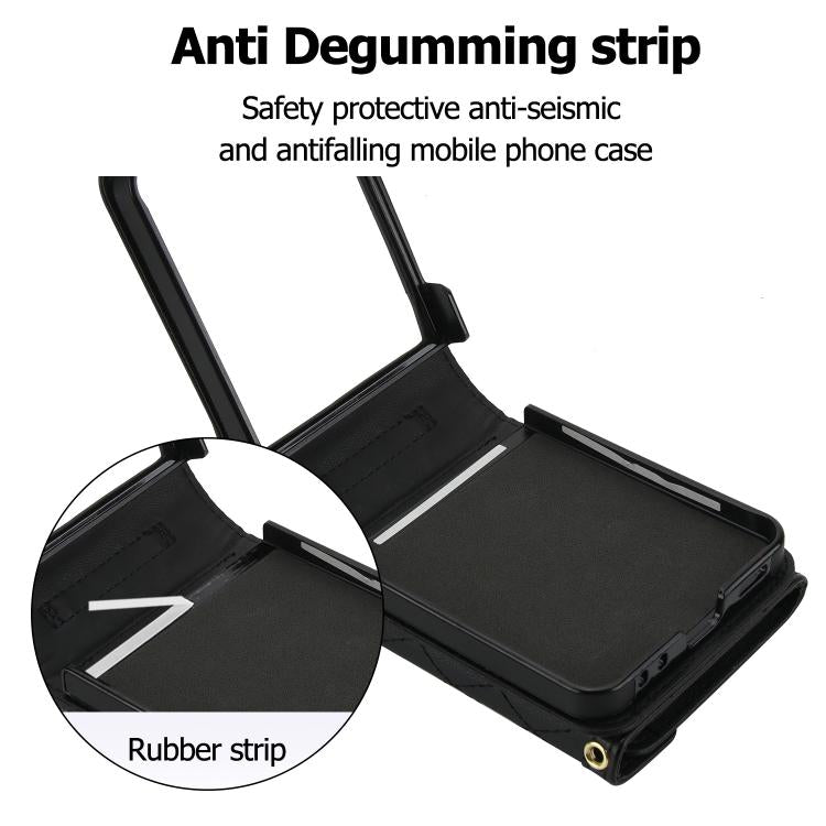 For Samsung Galaxy Z Flip7 5G Splicing Rhombic Texture Phone Case with Long & Short Lanyard, Not Included Pen(Black)