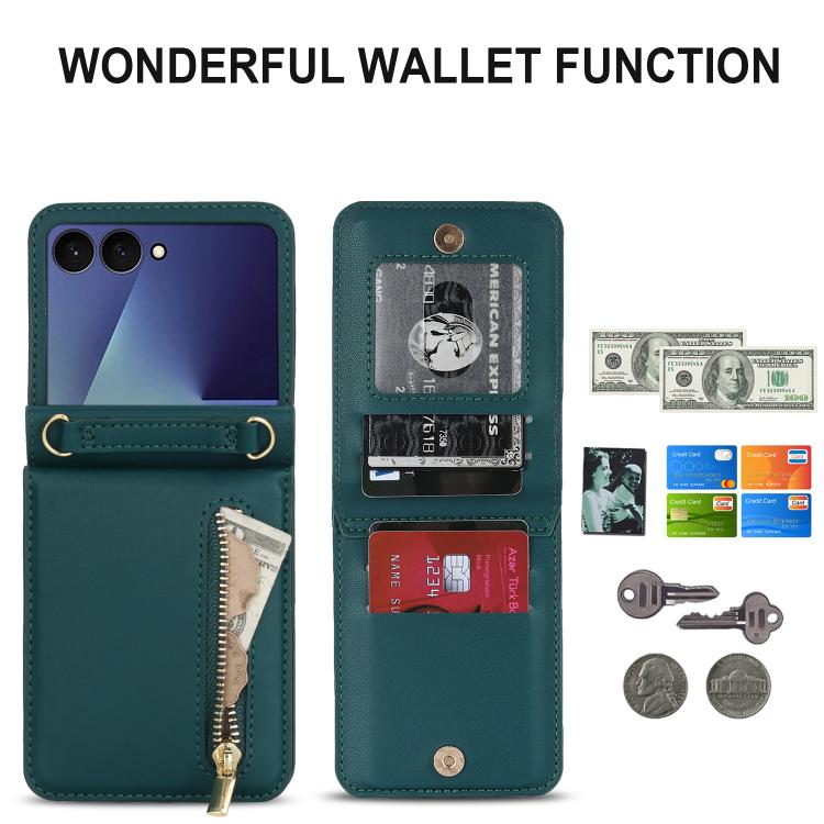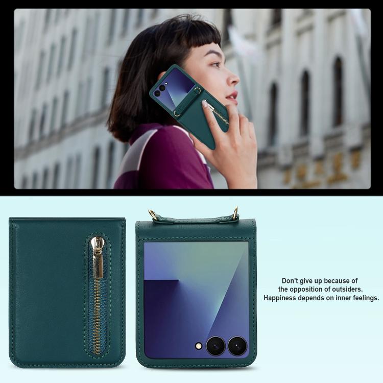 For Samsung Galaxy Z Flip7 5G Zipper Wallet Card Slot Leather Phone Case with Crossbody Strap(Green)