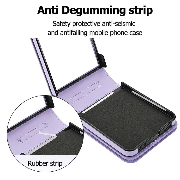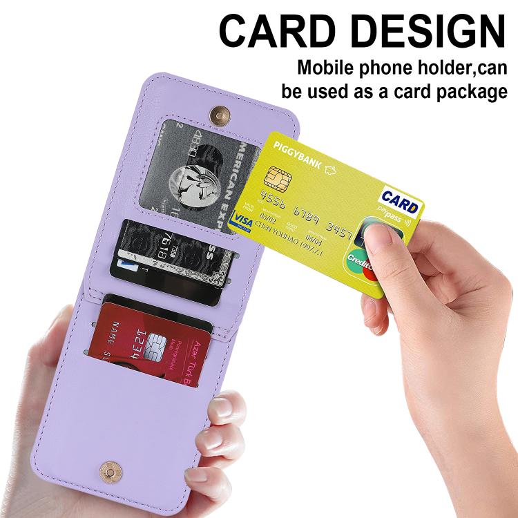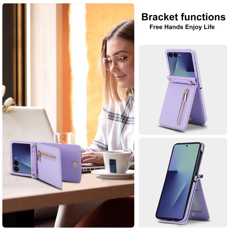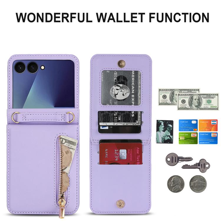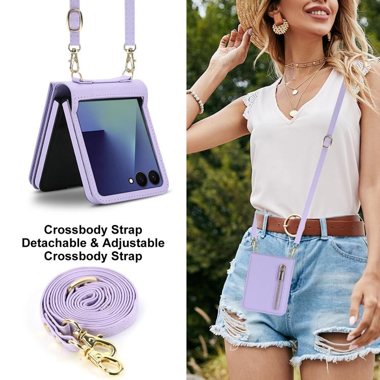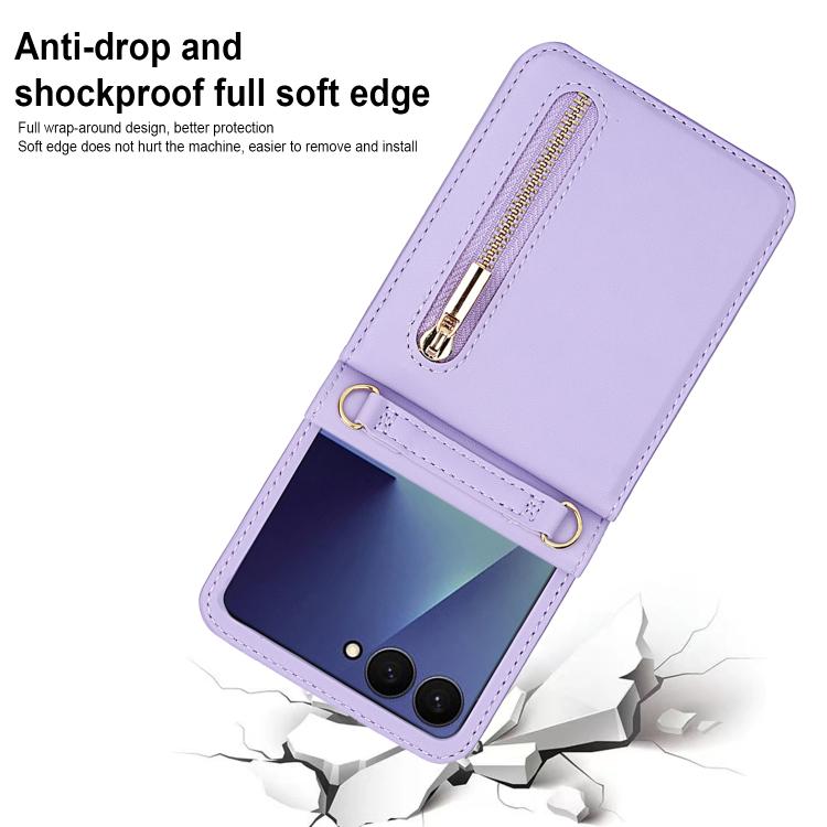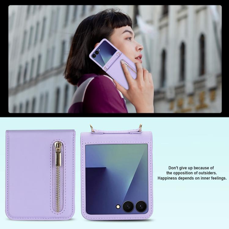 For Samsung Galaxy Z Flip7 5G Zipper Wallet Card Slot Leather Phone Case with Crossbody Strap(Purple)