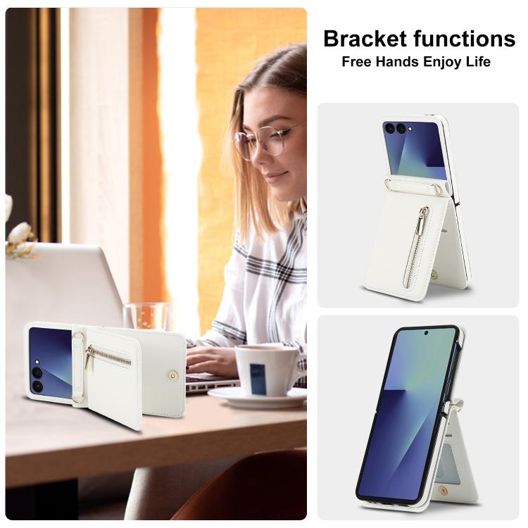 For Samsung Galaxy Z Flip7 5G Zipper Wallet Card Slot Leather Phone Case with Crossbody Strap(White)