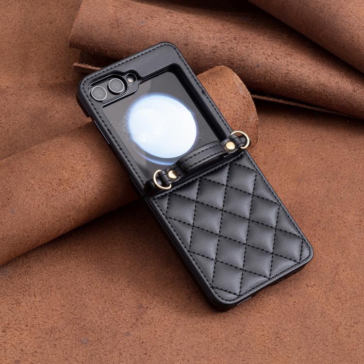 For Samsung Galaxy Z Flip7 Rhombus-shaped Crossbody Lanyard Leather Phone Case(Black)