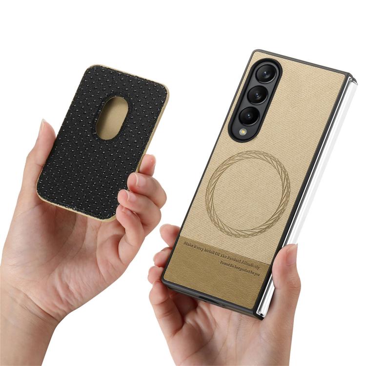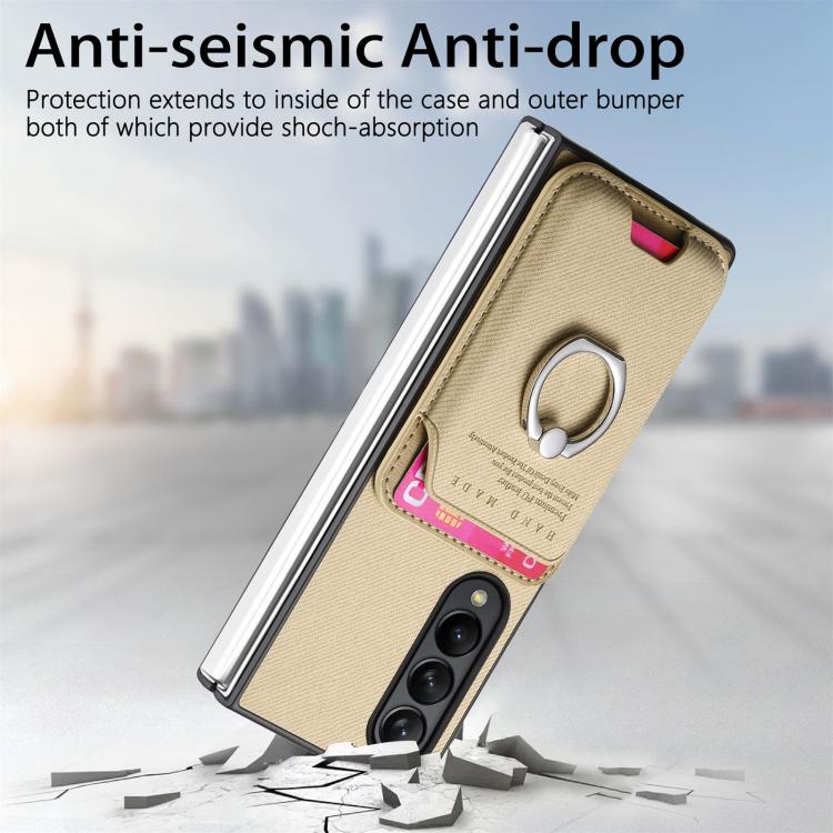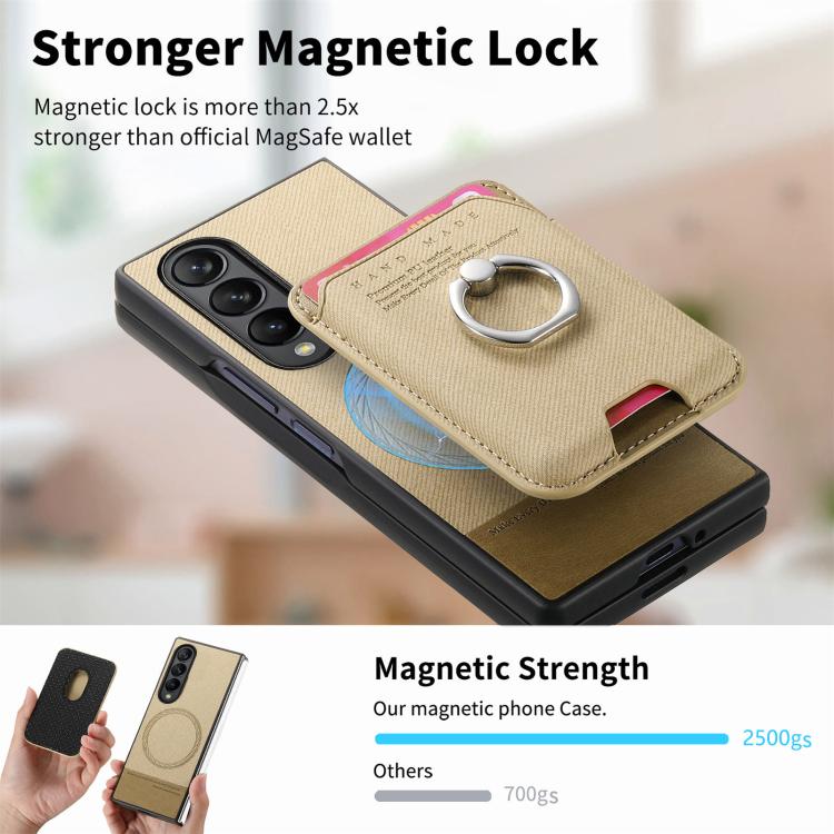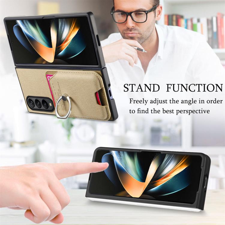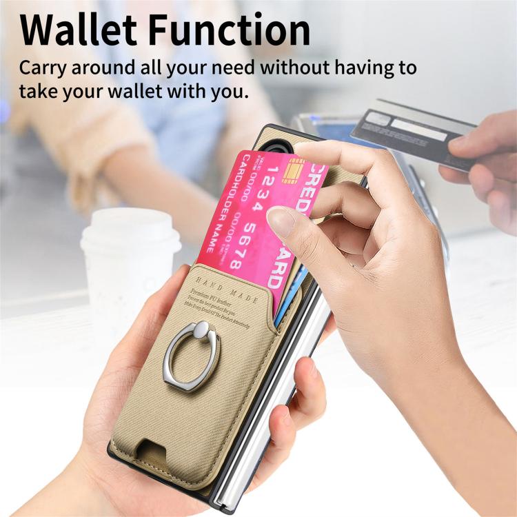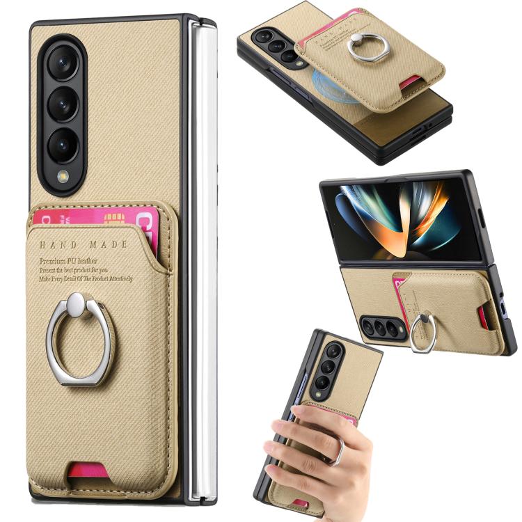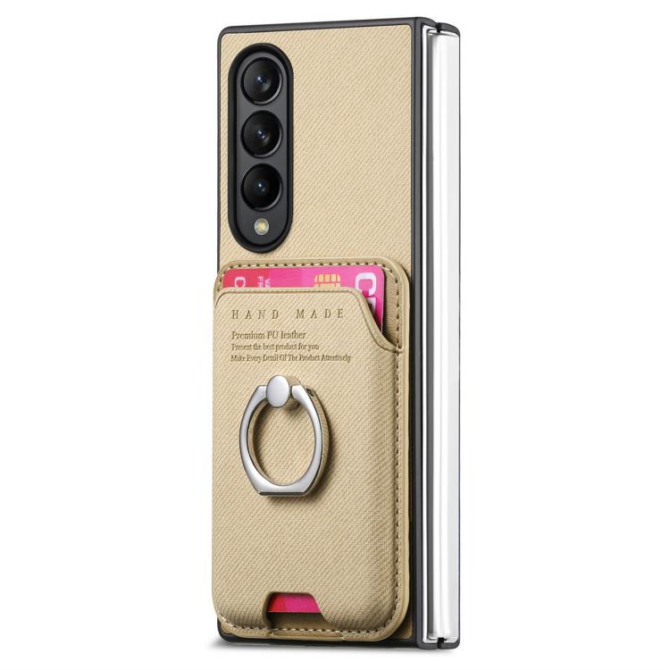 For Samsung Galaxy Z Fold4 5G Twill Fabric Card Bag Ring Magnetic Back Phone Case(Khaki)