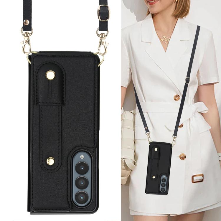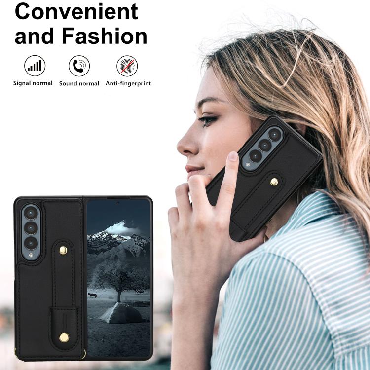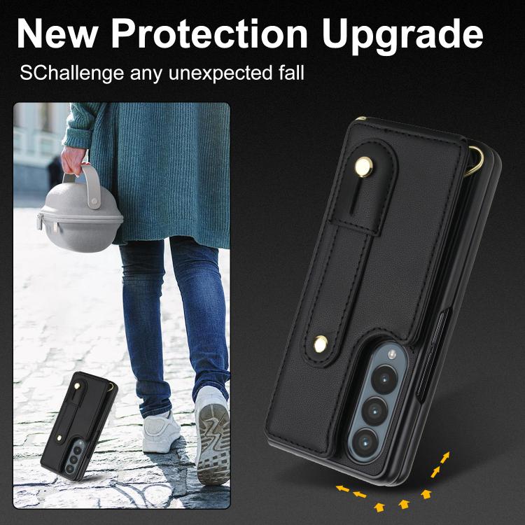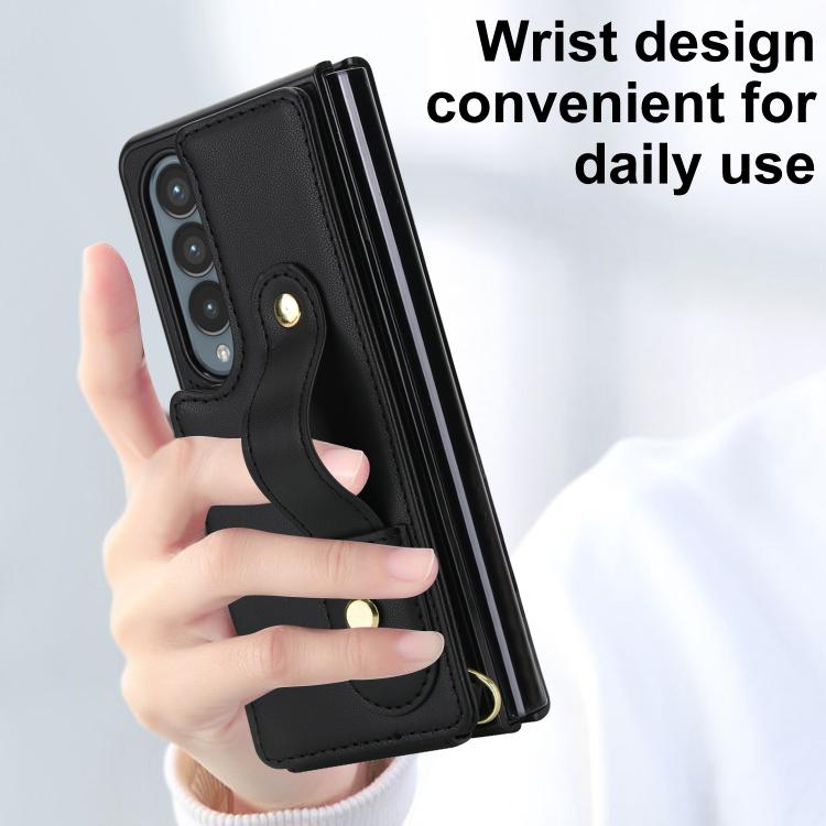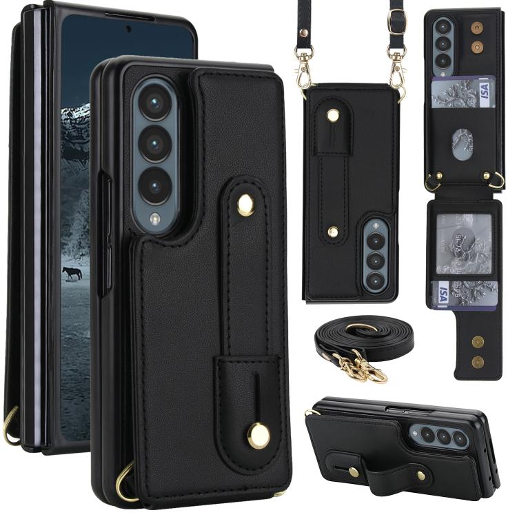 For Samsung Galaxy Z Fold4 5G Wristband Vertical Flip Wallet Back Cover Phone Case with Long Lanyard(Black)