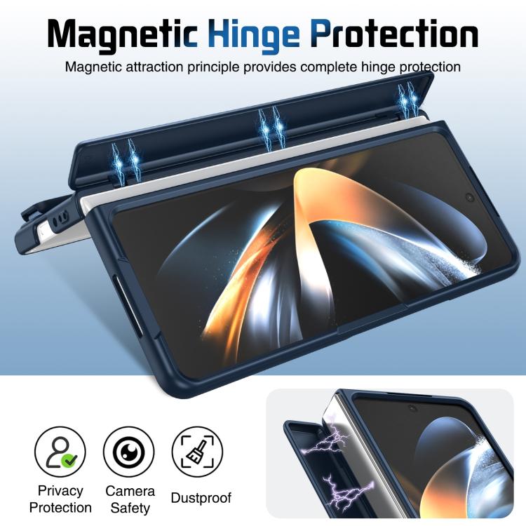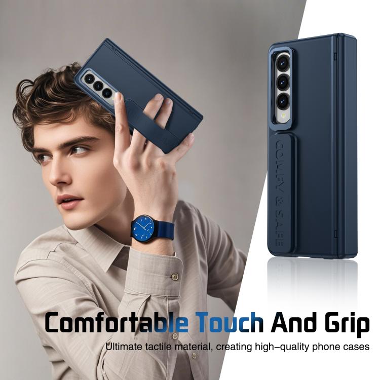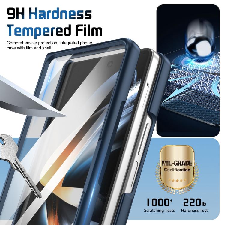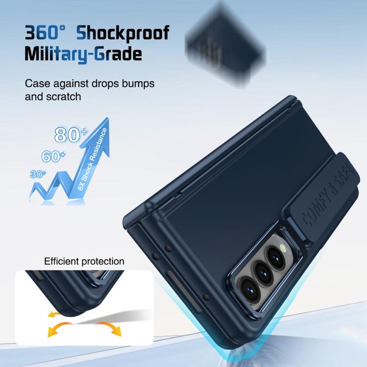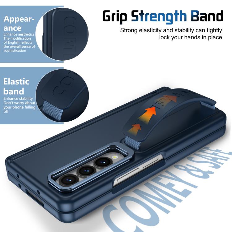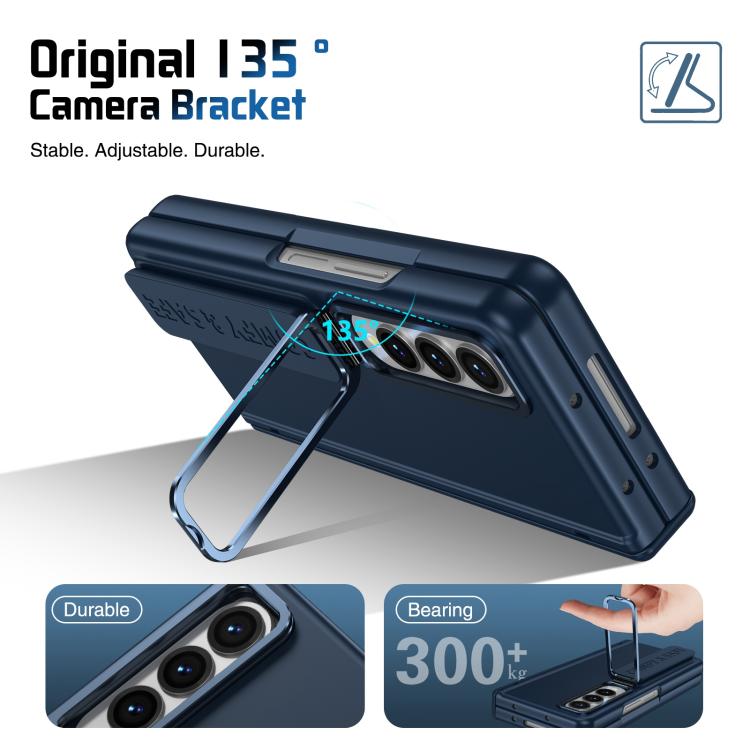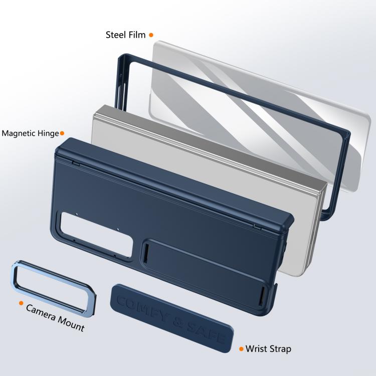 For Samsung Galaxy Z Fold4 Film Integrated Lens Frame Bracket Phone Case with Wristband(Dark Blue)