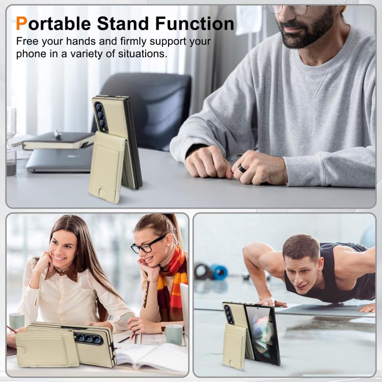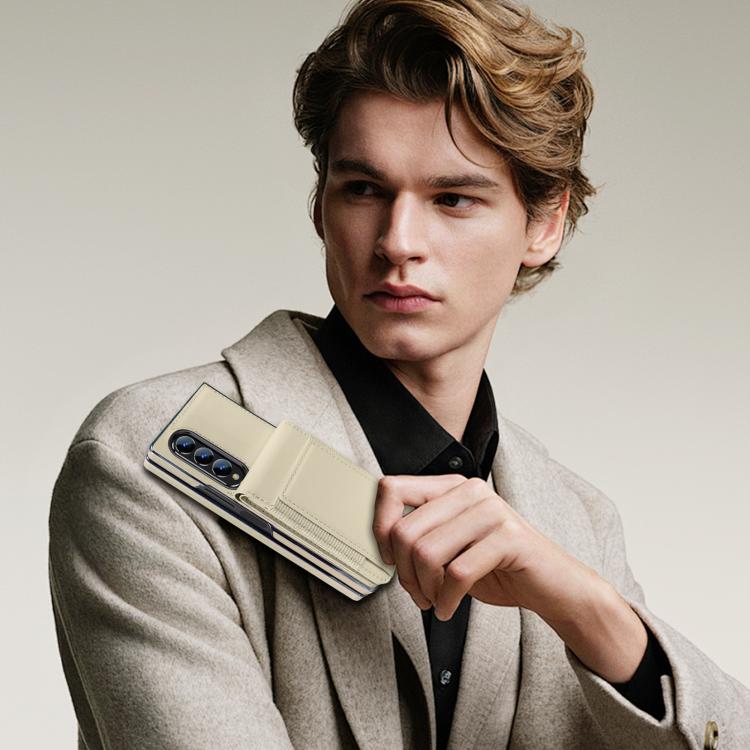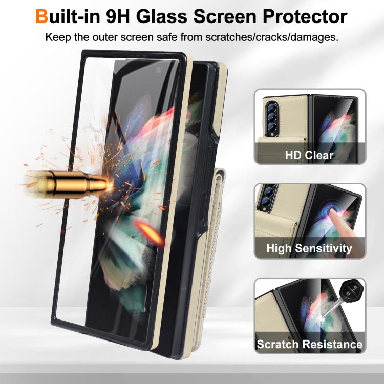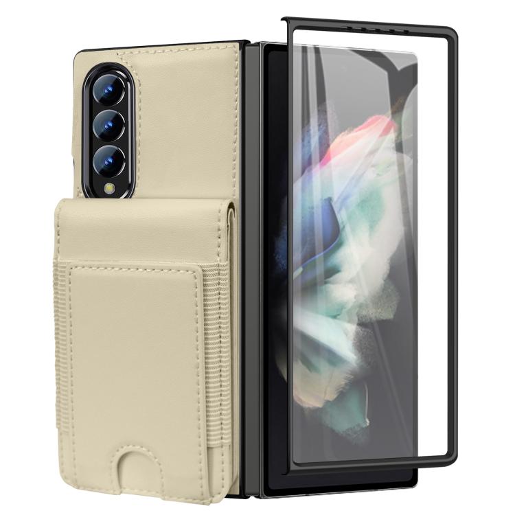 For Samsung Galaxy Z Fold4 Folding Card Holder Tempered Film Integrated Leather Phone Case(Beige)