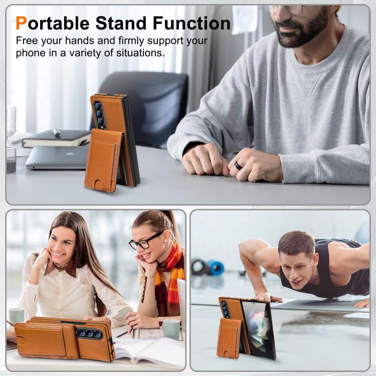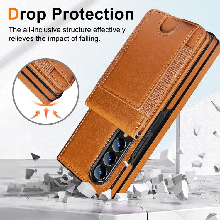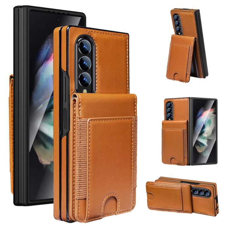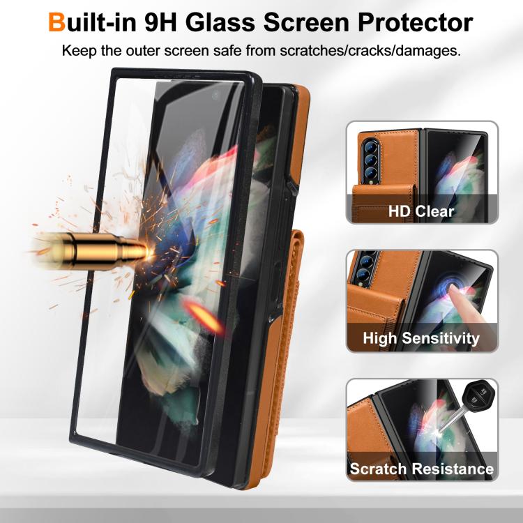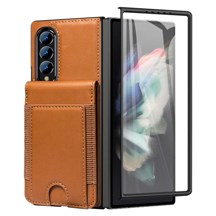 For Samsung Galaxy Z Fold4 Folding Card Holder Tempered Film Integrated Leather Phone Case(Brown)