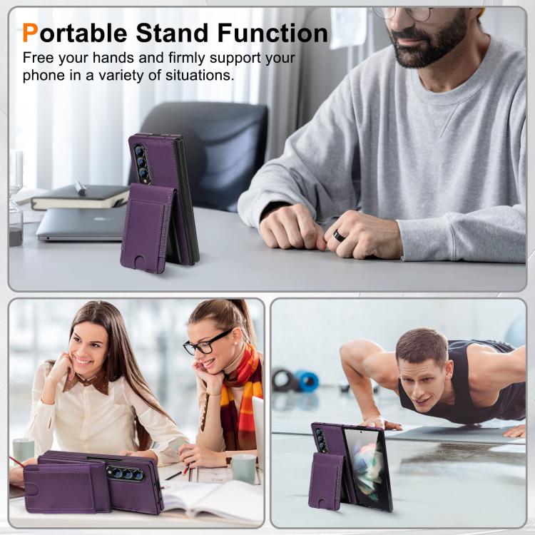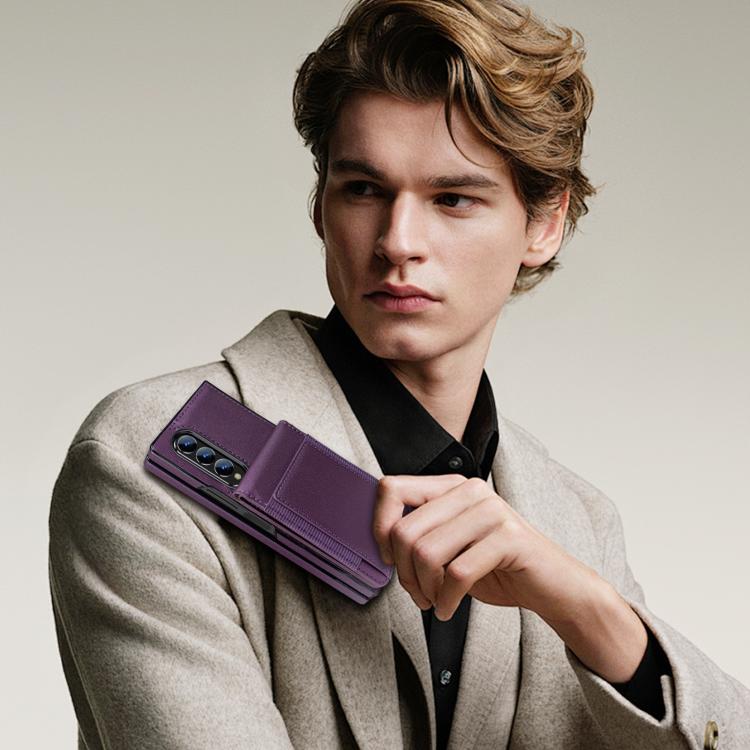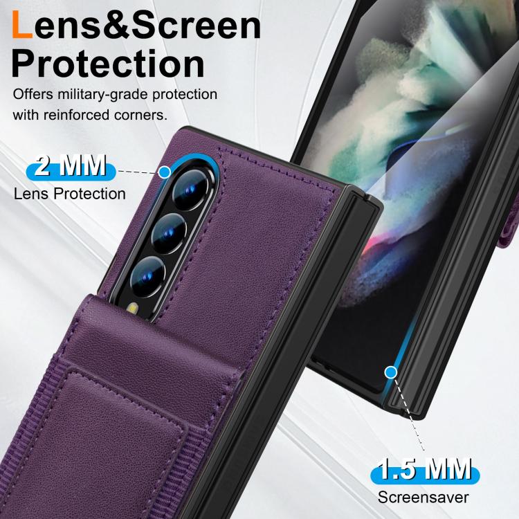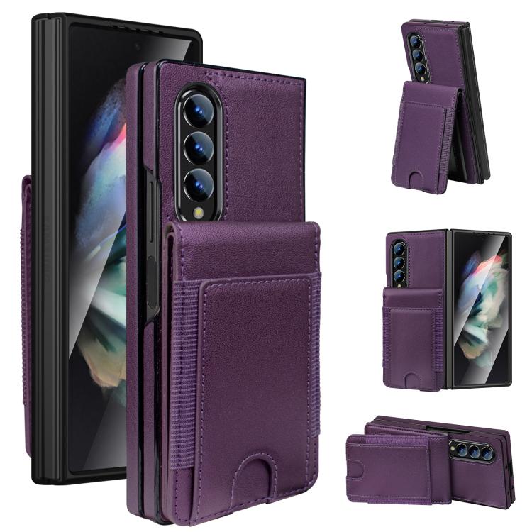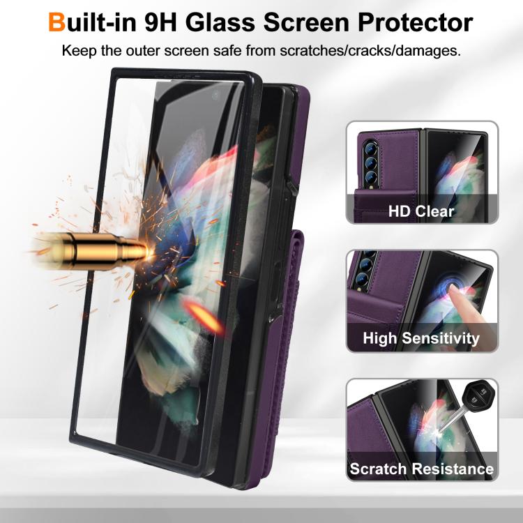 For Samsung Galaxy Z Fold4 Folding Card Holder Tempered Film Integrated Leather Phone Case(Dark Purple)