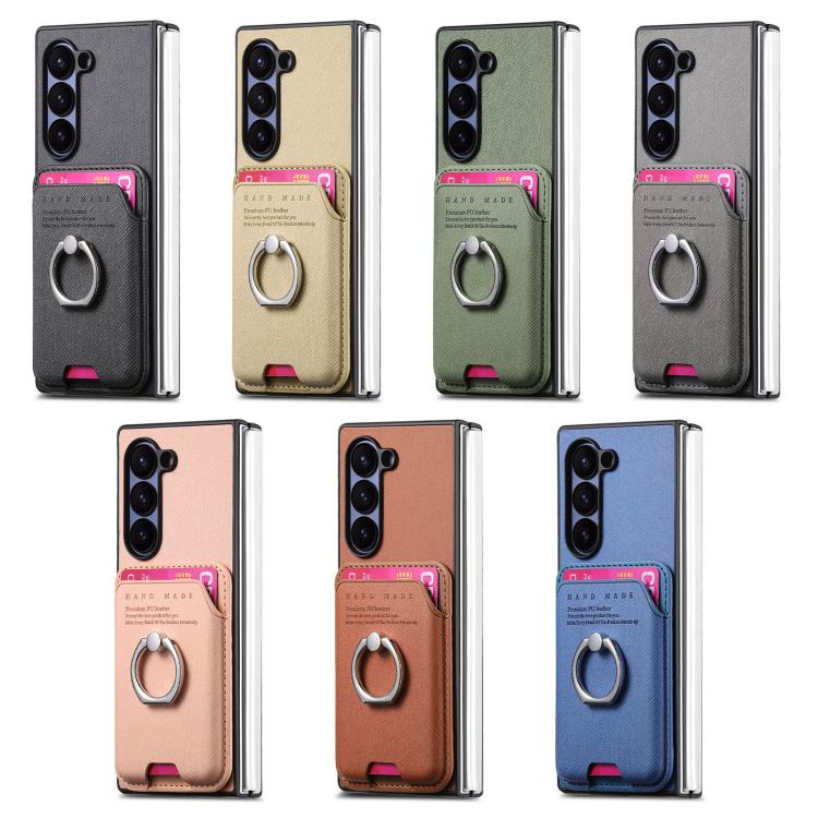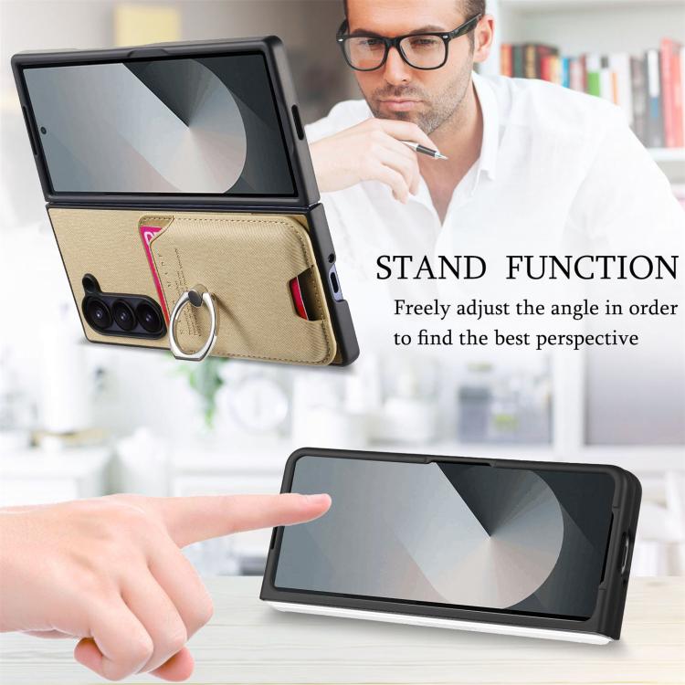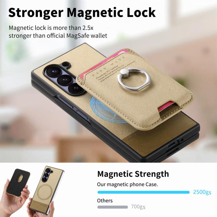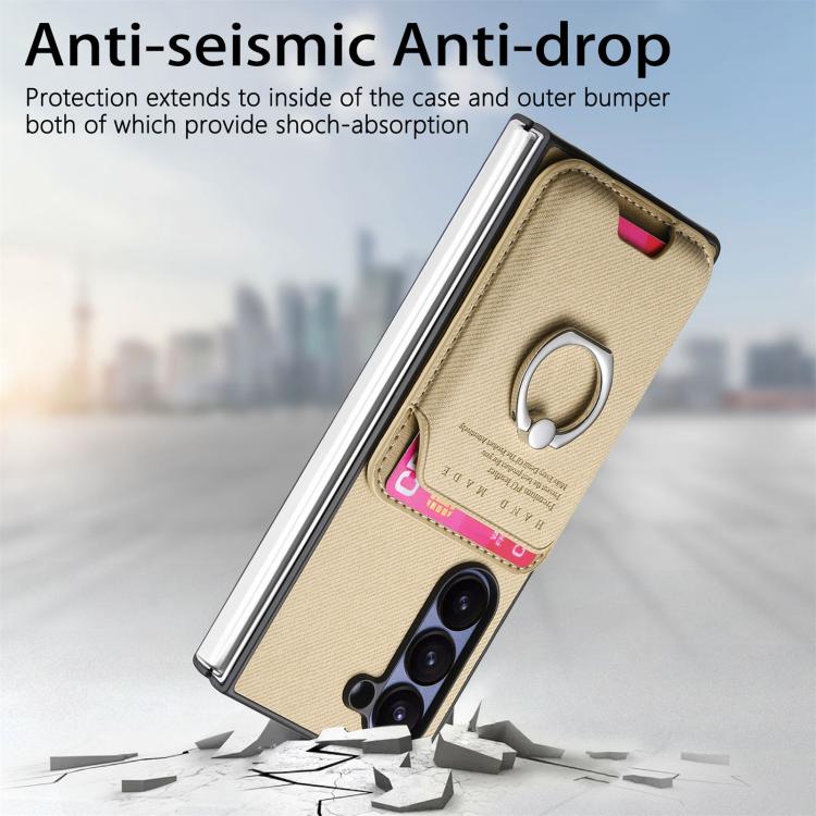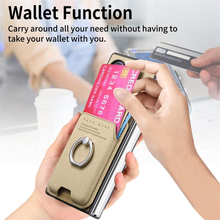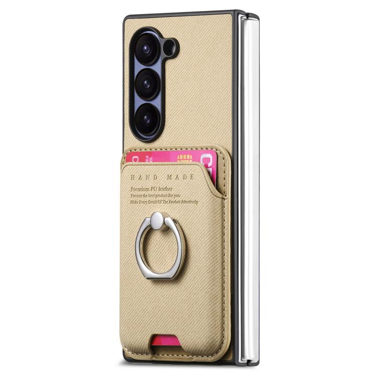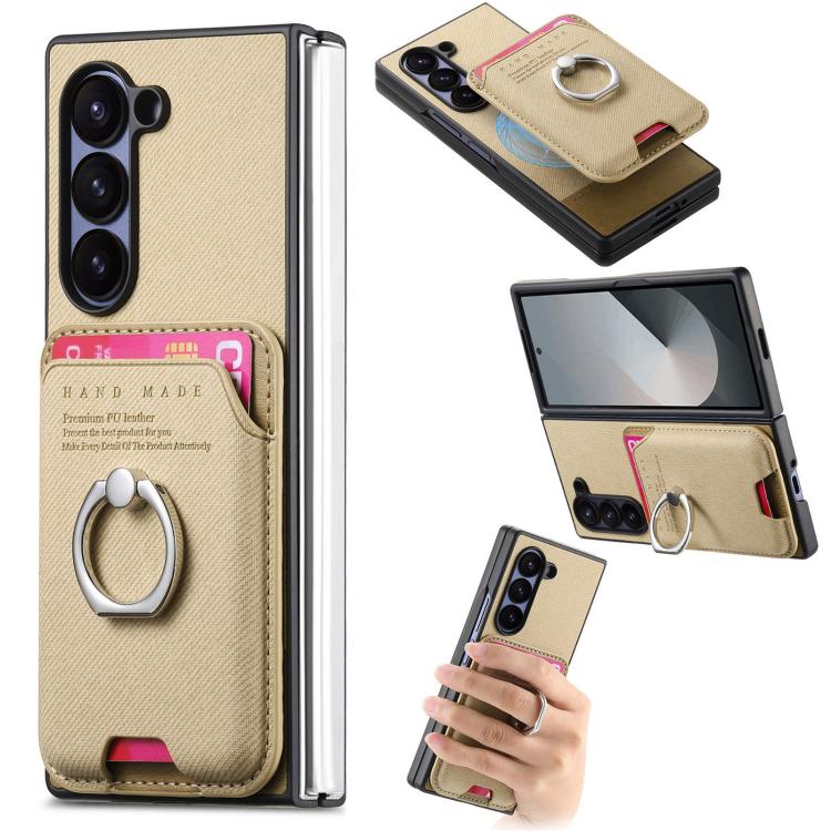 For Samsung Galaxy Z Fold6 5G Twill Fabric Card Bag Ring Magnetic Back Phone Case(Khaki)