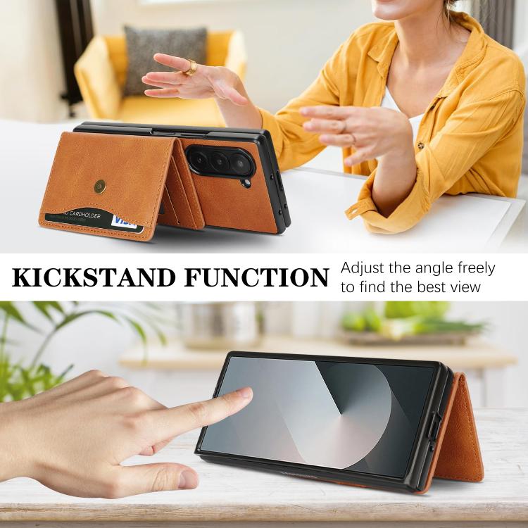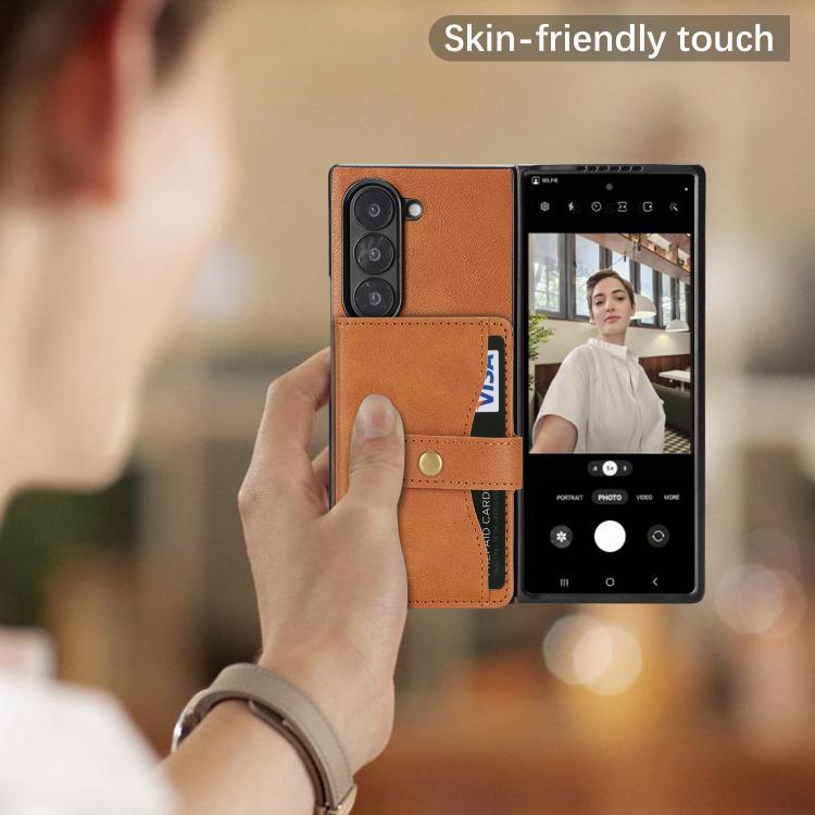 For Samsung Galaxy Z Fold6 Kalebol Magnetic Button Card Bag MagSafe Ring Leather Phone Case(Brown)
