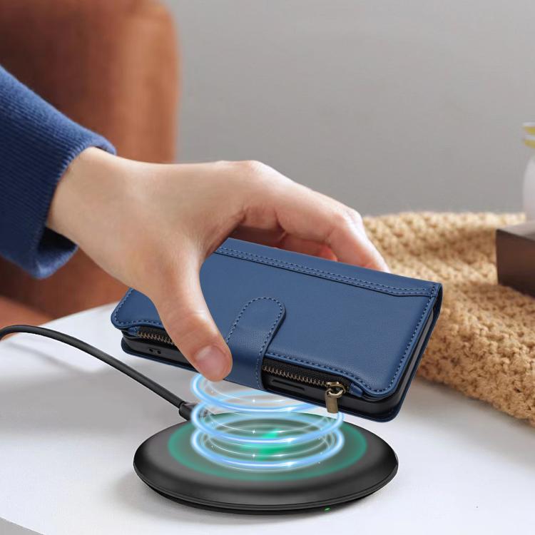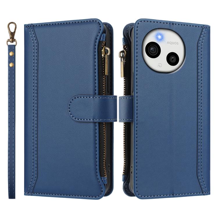 For Sharp Aquos Sense10 Magnetic Closure 9 Card Slots Zipper Leather Case with Hand Strap(Dark Blue)
