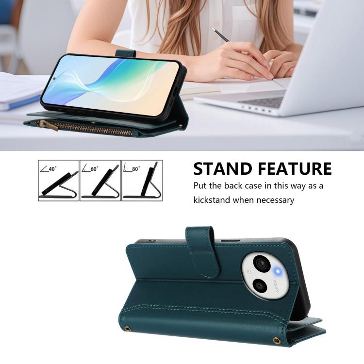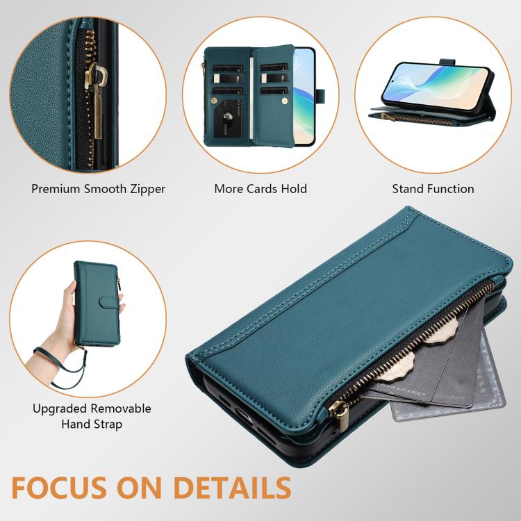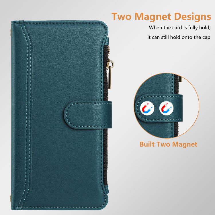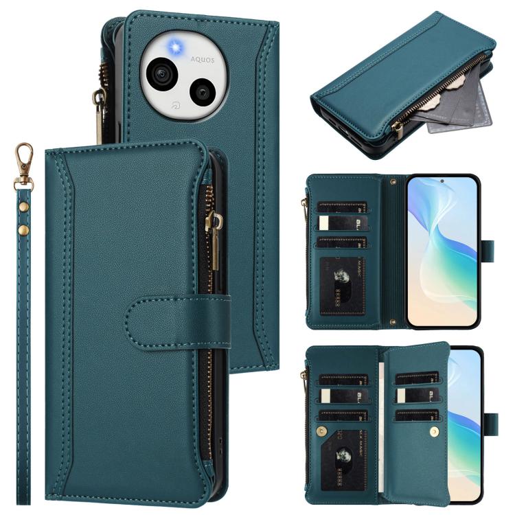For Sharp Aquos Sense10 Magnetic Closure 9 Card Slots Zipper Leather Case with Hand Strap(Dark Green)