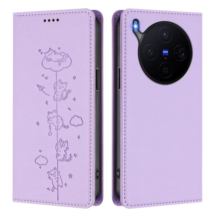 For vivo X300 Cute Cats Embossed Magnetic RFID Vegan Leather Phone Case(Light Purple)