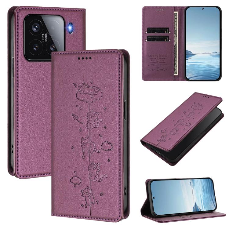 For Xiaomi 15 Cute Cats Embossed Magnetic RFID Vegan Leather Phone Case(Violet Purple)