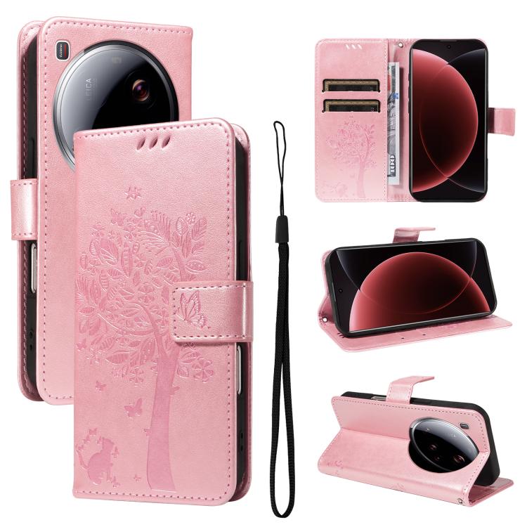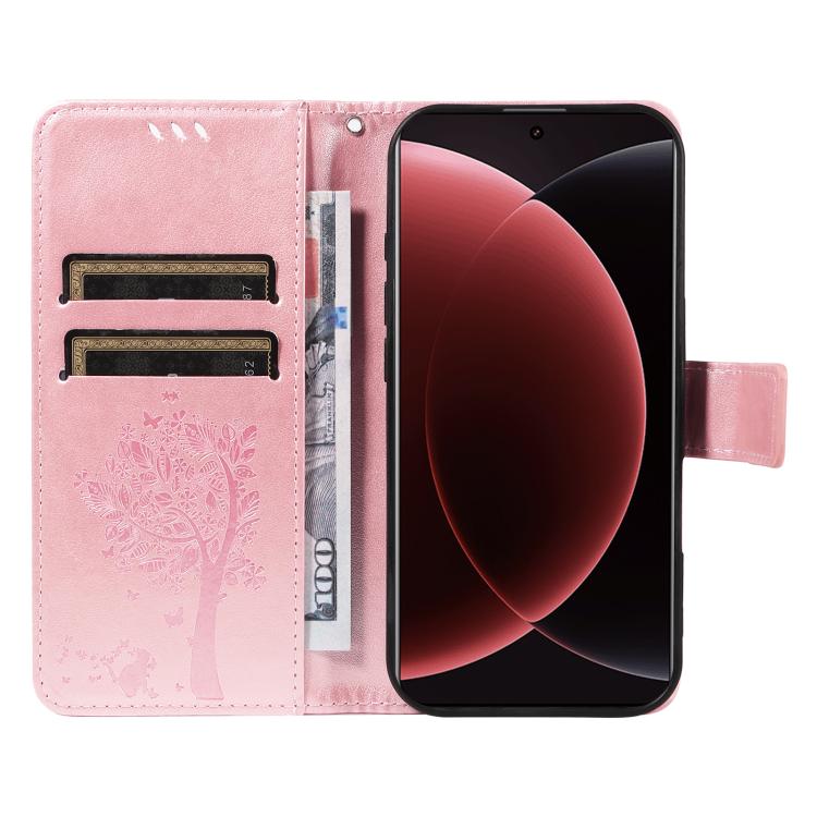 For Xiaomi 15 Ultra 5G Global Tree & Cat Embossed Pattern Flip Leather Phone Case(Rose Gold)