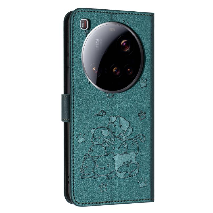 For Xiaomi 15 Ultra Embossed Kitten Phone Leather Case with Lanyard(Dark Green)