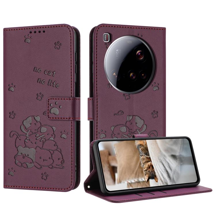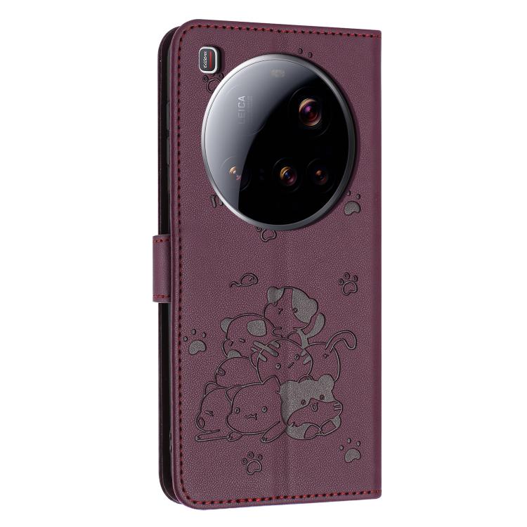 For Xiaomi 15 Ultra Embossed Kitten Phone Leather Case with Lanyard(Wine Red)