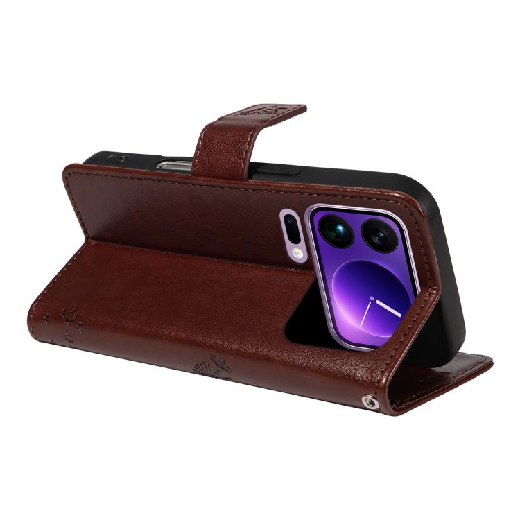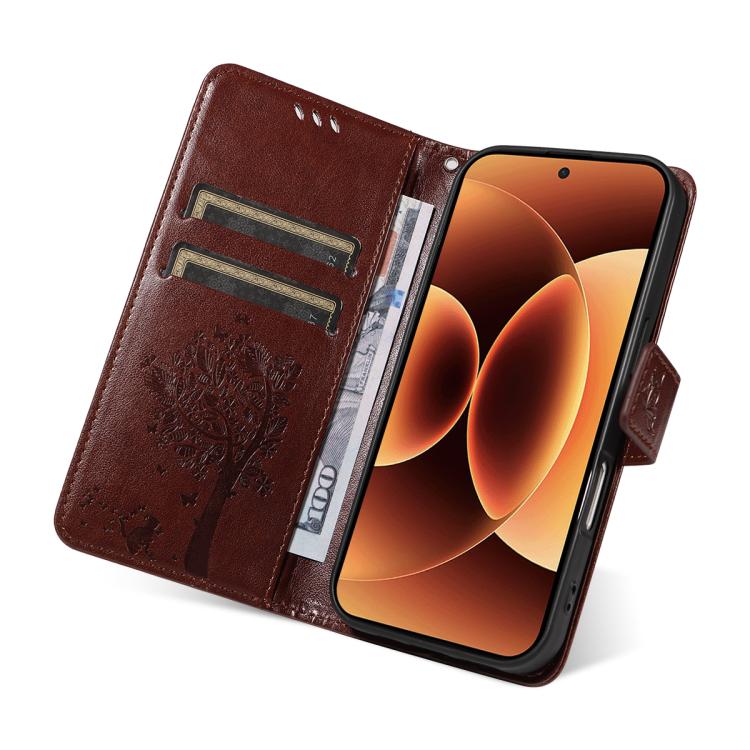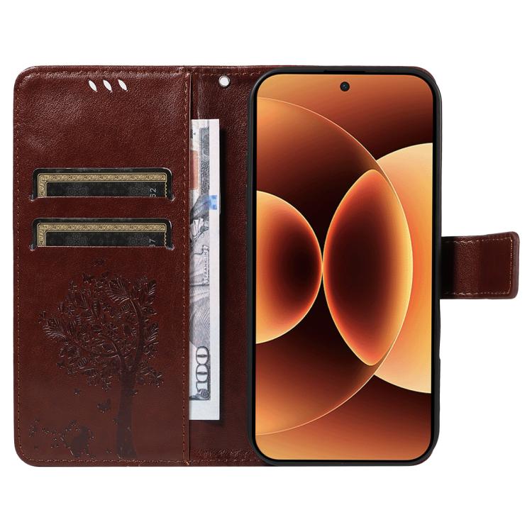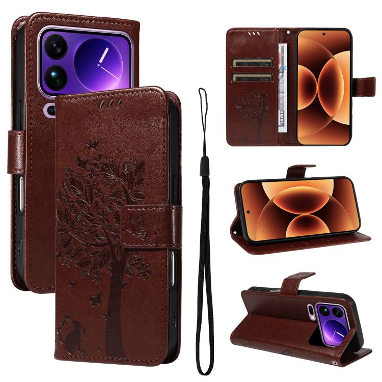 For Xiaomi 17 Pro Max Tree & Cat Embossed Pattern Flip Leather Phone Case(Coffee)