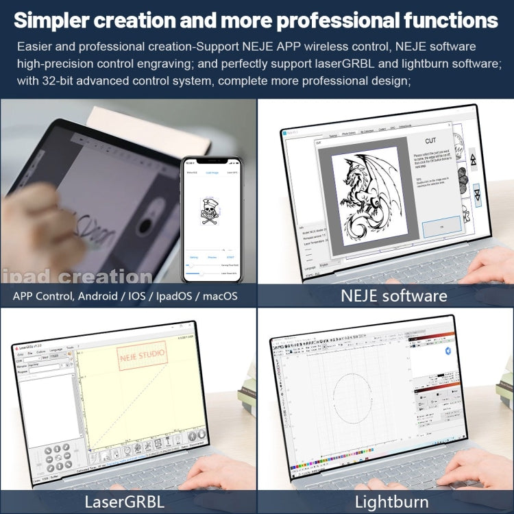 5. 32-bit control system, the fastest speed can reach 200??,000mm/min, support LaserGRBL, Lightburn, NEJE software, NEJE APP (Android, iOS, ipadOS, macOS)