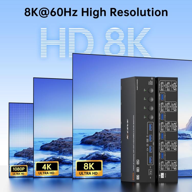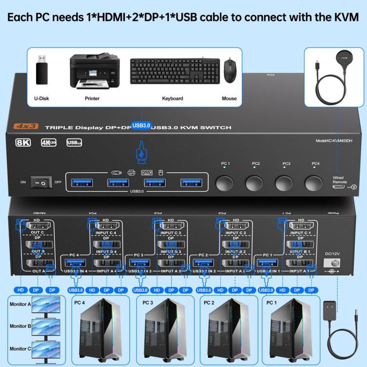1. HDMI + Dual DisplayPort Triple-Screen KVM Switch: Connects 3 monitors and 4 computers, allowing control of 3 or 4 computers (laptops) via a single keyboard and mouse, sharing 3 monitors and 4 USB 3.0 ports.