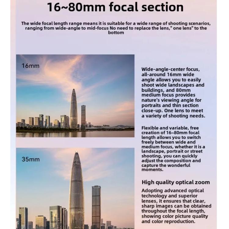 4. 16~80mm focal length: A wide focal length range means it is suitable for a variety of shooting scenes, from wide angle to medium focus.
