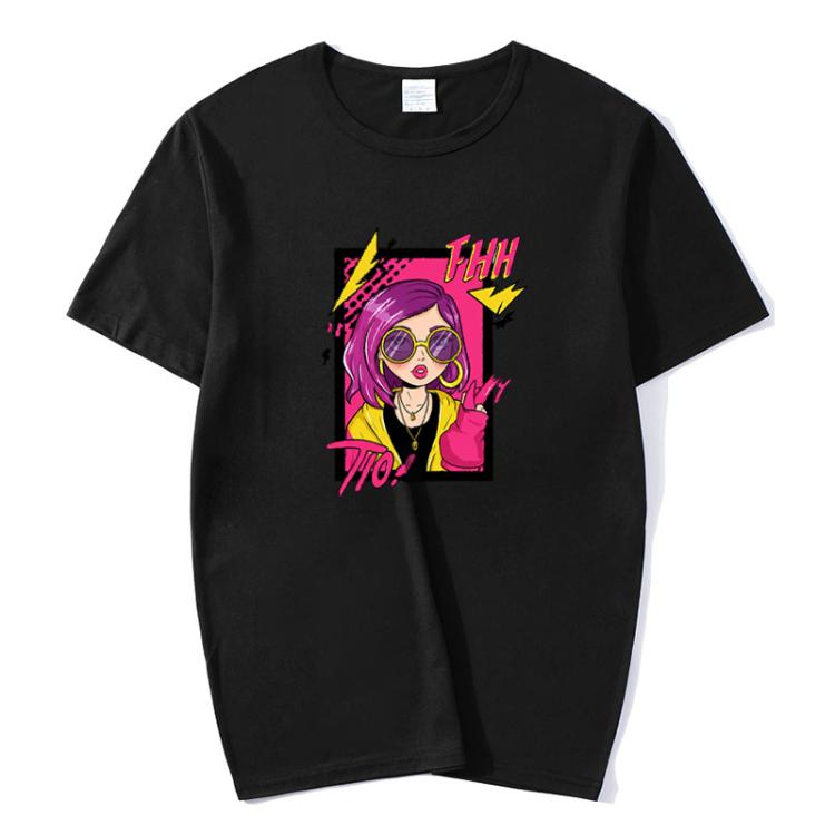 Purple Hair Girl Printed Round Neck Modal Short Sleeve T-shirt Print On Your Demand, Size:XXXL(Black)