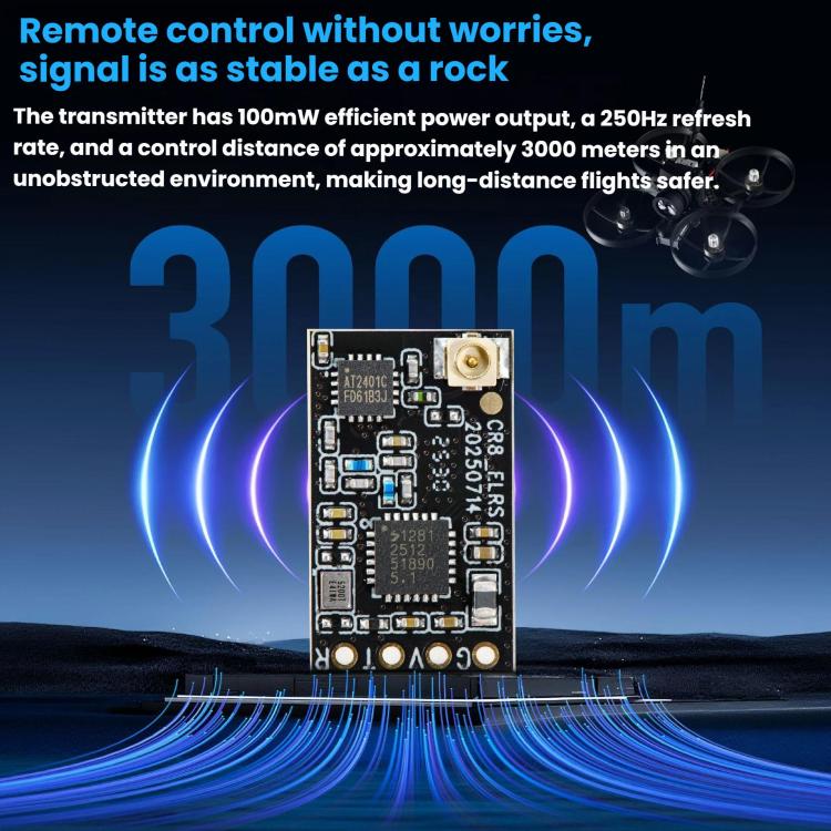 3. 100mW power output on the transmitter side, 250Hz refresh rate, no-obstruction environment control distance of about 3,000 meters, long-distance flight is more secure