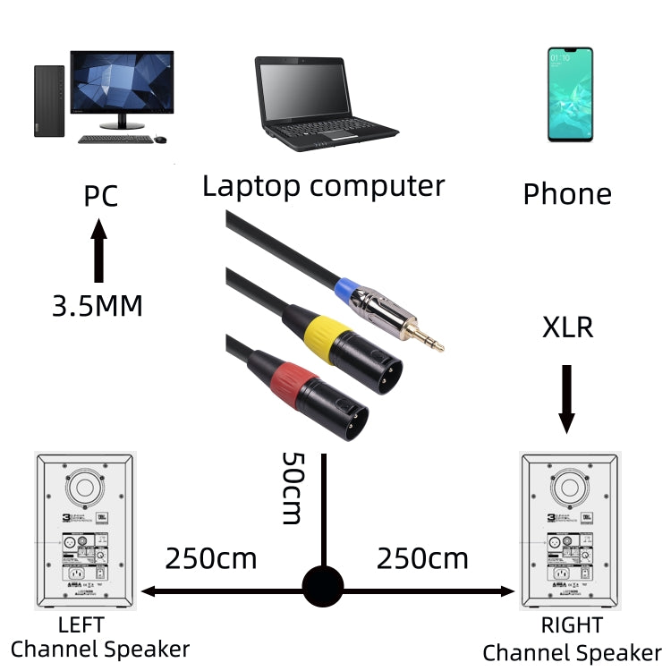 2. The 3.5mm end of the wire is 50cm from the fork, and the length from the Canon end to the fork is 250cm. When connecting a single-channel active monitor speaker, the speakers can be separated by 5 meters