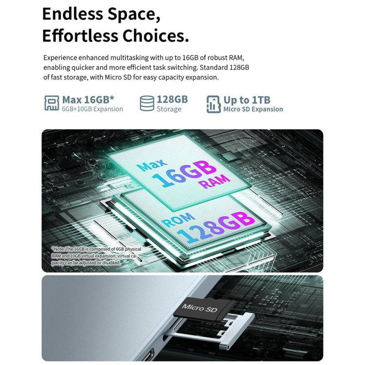 5. Ample Memory: Comes with 6GB RAM, expandable by 10GB virtual RAM, and 128GB storage for smooth multitasking and plenty of space.