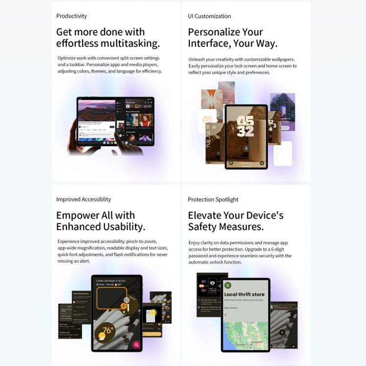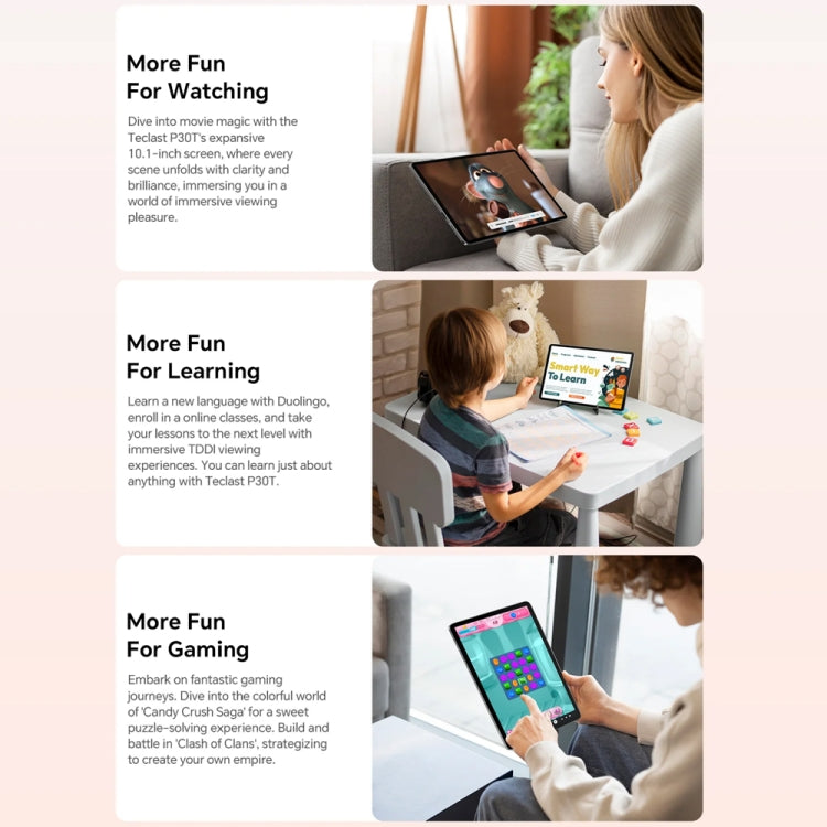 3. Advanced Android 14 Experience: Featuring Android 14, the P30T tablet provides a landscape-enhanced Parallel View, a convenient Taskbar for efficient multitasking, and robust parental control options for safe usage.