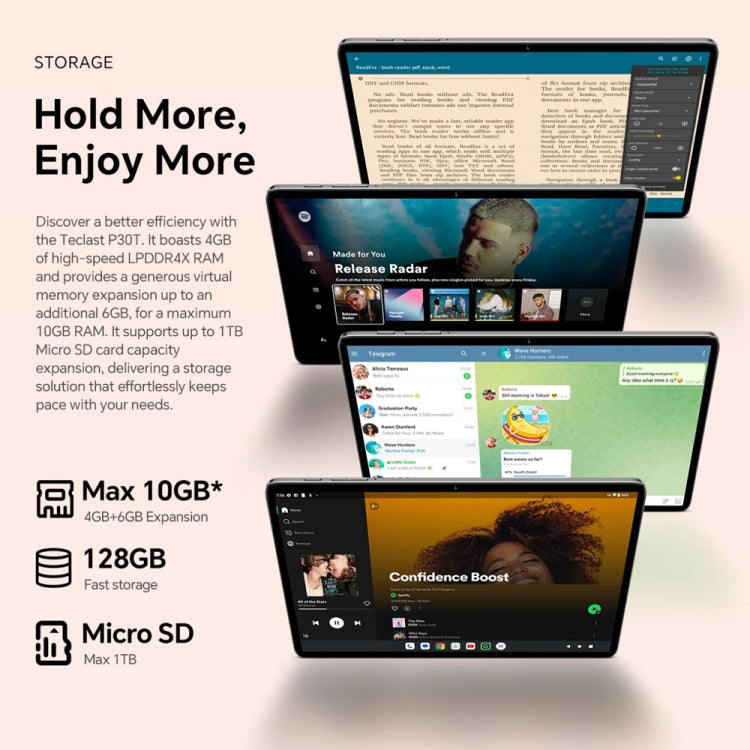 5. Ample Storage and Memory: Equipped with a maximum of 10GB LPDDR4 RAM and 128GB of fast storage, expandable up to 1TB with a Micro SD card, the P30T tablet offers abundant space for all your needs.