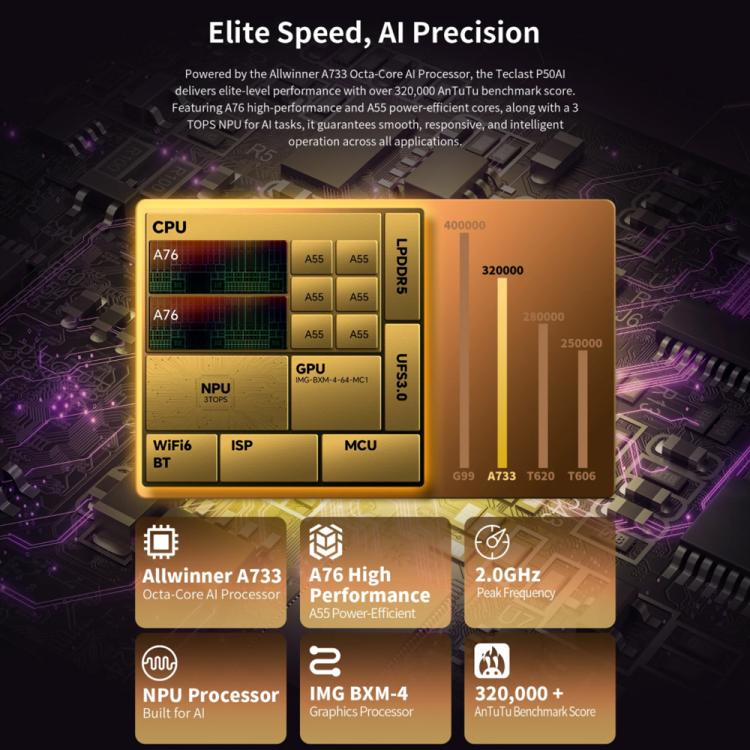 3. The P50AI tablet features the powerful Allwinner A733 Octa-Core processor, delivering high-performance and energy-efficient multitasking. It ensures fast response times, smoother app usage, and optimal performance for all your applications.