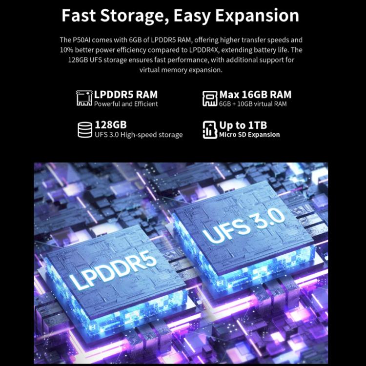 6. With up to 16GB of RAM (6GB LPDDR5 plus 10GB virtual) and 128GB UFS3.0 storage, the P50AI provides fast data access and ample space, ensuring smooth multitasking and plenty of storage for apps and media.