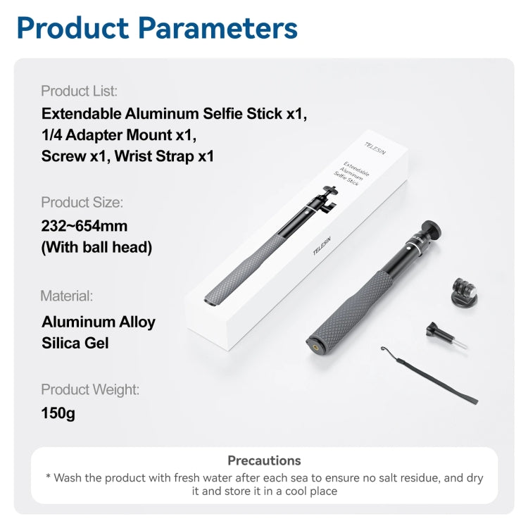 TELESIN WSS-001 65.4cm Aluminum Alloy Waterproof Ball Head Selfie Stick Diving Shooting Sports Camera Extension Stick
