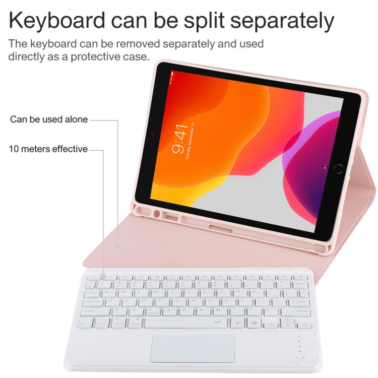TG-102BCS Detachable Bluetooth White Keyboard + Microfiber Leather Tablet Case for iPad 10.2 inch / iPad Air (2019), with Touch Pad & Backlight & Pen Slot & Holder (Pink)