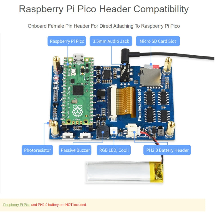 FeaturesThe Pico-Eval-Board is an overall evaluation solution designed for Raspberry Pi Pico. With 3.5inch 65K colorful LCD display and misc helpful onboard components, this evaluation board allows you to try almost every on chip peripheral of the RP2040, eliminating the mess wiring. It is an ideal choice for user to fast get started with the Raspberry Pi Pico, as well as the RP2040 chip.