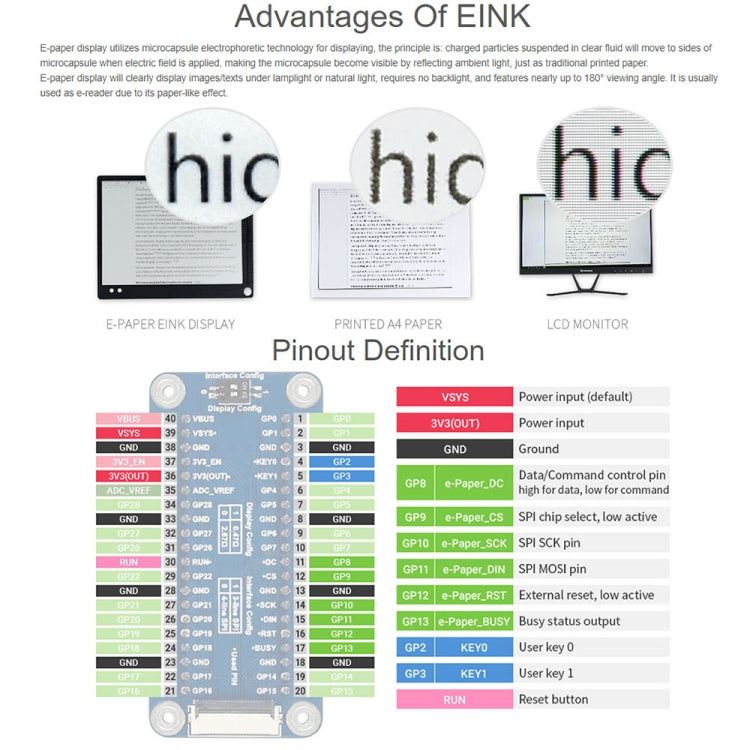Advantages Of EINK1. E-paper display utilizes microcapsule electrophoretic technology for displaying, the principle is: charged particles suspended in clear fluid will move to sides of microcapsule when electric field is applied, making the microcapsule become visible by reflecting ambient light, just as traditional printed paper.