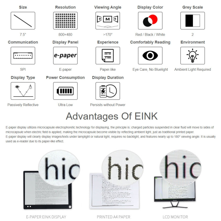 Advantages Of EINK1. E-paper display utilizes microcapsule electrophoretic technology for displaying, the principle is: charged particles suspended in clear fluid will move to sides of microcapsule when electric field is applied, making the microcapsule become visible by reflecting ambient light, just as traditional printed paper.