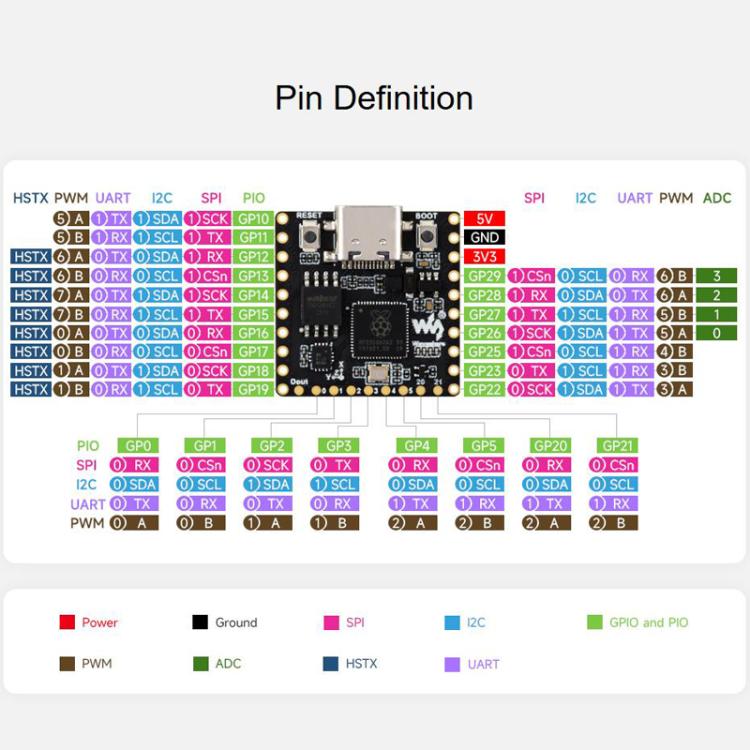 12. 1 HSTX, 2 SPI, 2 12C, 2 UART, 4 12-bit ADC and 16 controllable PWM channels