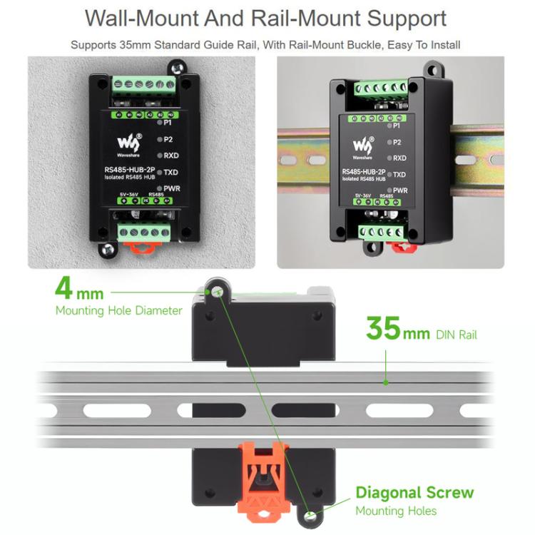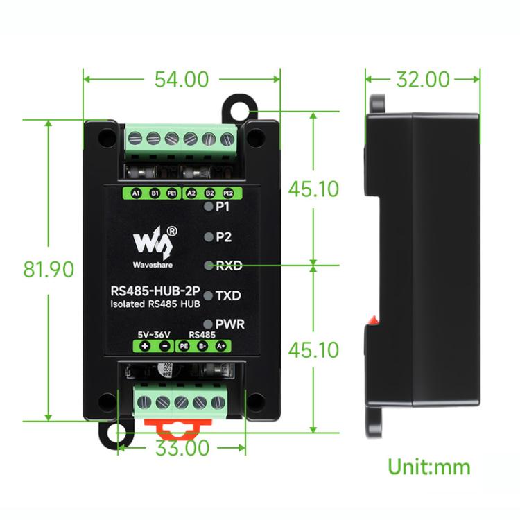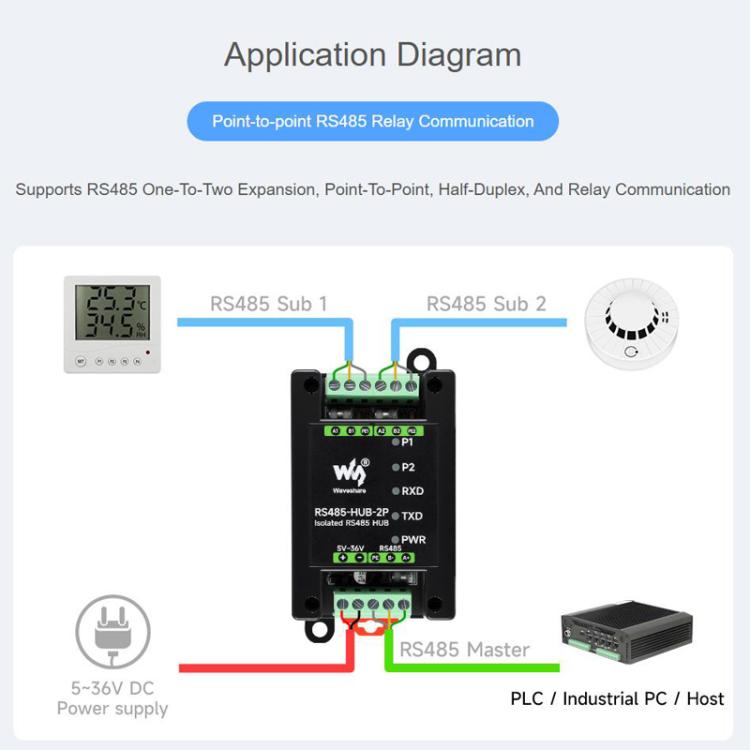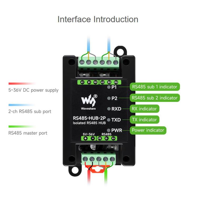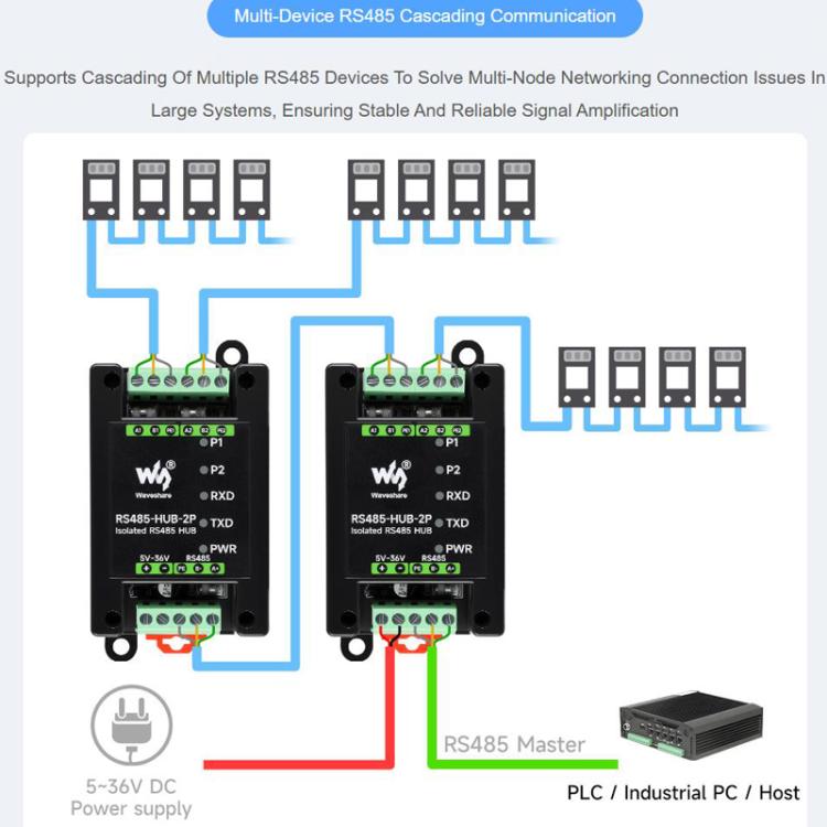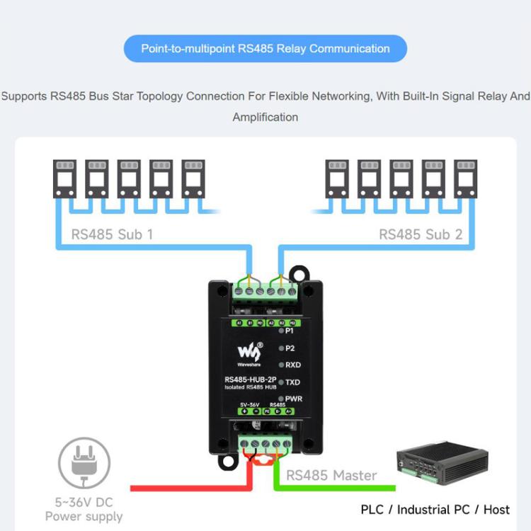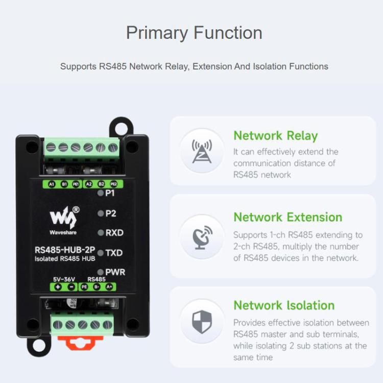 1. 2 RS485 slave ports can be extended through 1 RS485 master port, which can realize RS485 network relay, expansion and isolation functions