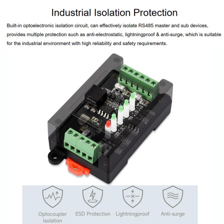 6. Built-in optoelectronic isolation protection circuit, RS485 master-slave device isolation, RS485 master-slave device can effectively protect the device from the ground potential difference between the equipment, static electricity, lightning and surge damage, can be applied to the reliability and safety requirements of the higher industrial environment