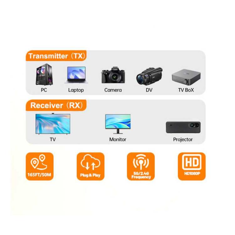 3.Wireless hdmi transmitter and receiver distance can reach 165ft, equipped with dual-band chip and LDS antenna,more fast and stable. Provide 2.4G/5G frequency dual band ultra-low latency wireless transmission rate and ultra-long-distance transmission.