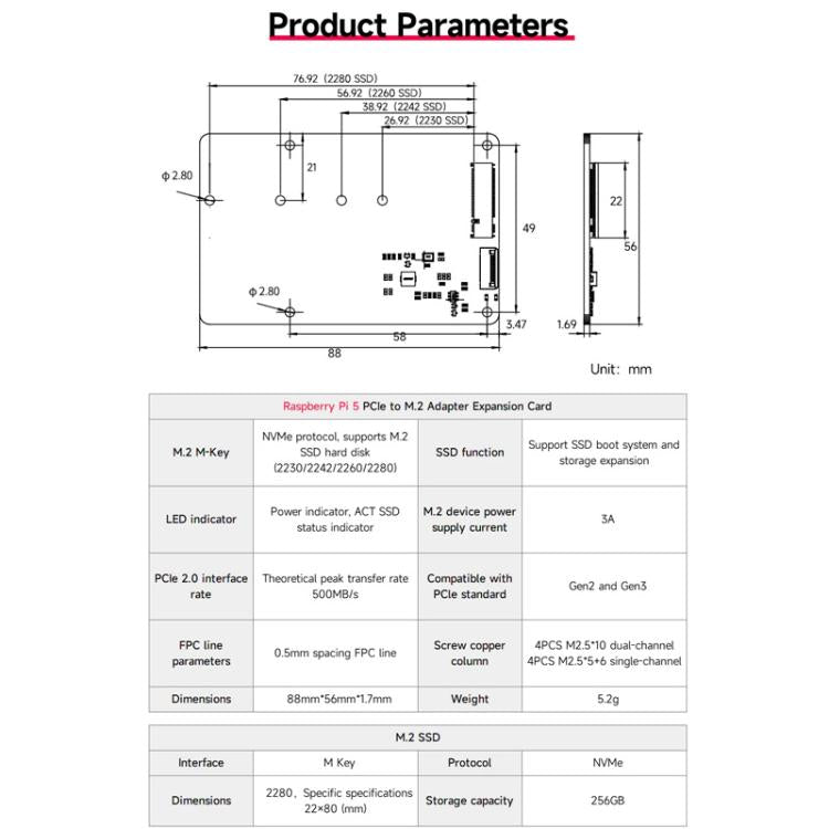 1. This PCIe to M.2 expansion board specially designed for Raspberry Pi 5 is designed to bring more possibilities to your Raspberry Pi projects. With this expansion board, you can easily connect a high-speed M.2 NVMe solid-state drive to the Raspberry Pi 5, greatly increasing data transfer speed and storage capacity. It supports M.2 solid-state drives of various sizes (such as 2230, 2242, 2260 and 2280), and the installation process is simple and intuitive, so you can get started quickly without complicated settings. It not only expands the storage space of Raspberry Pi 5, but also provides better support for your computing tasks, making your Raspberry Pi 5 capable of more complex application scenarios.