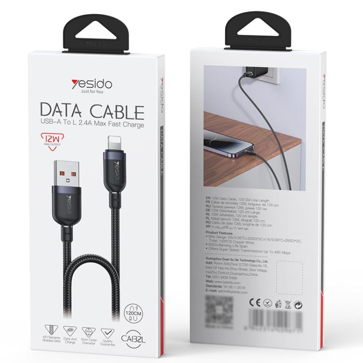 Yesido CA132L 12W 2.4A USB to 8 Pin Charging Data Cable, Length:1.2m(Black)