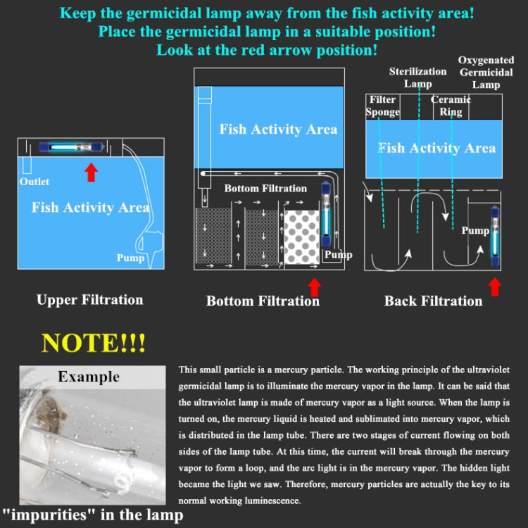 5. The principle of ultraviolet sterilization: when water flows through the device, it is briefly irradiated by 253.7nm strong wavelength ultraviolet rays, destroying the DNA of microorganisms, causing it to lose its reproductive ability and thereby dying. The water was killed and the healthy water body was restored.