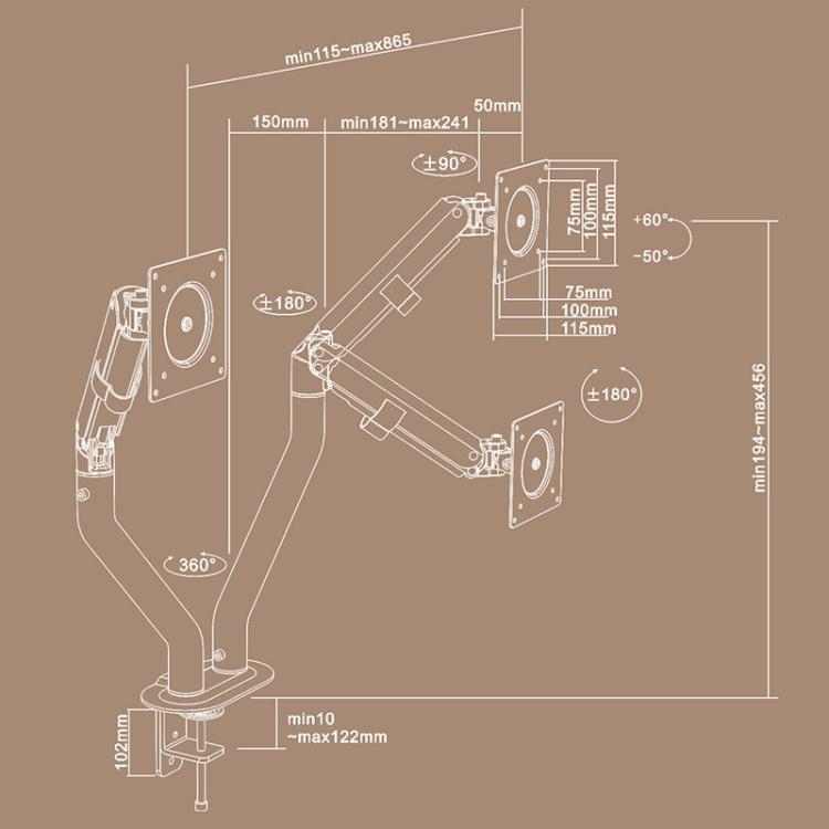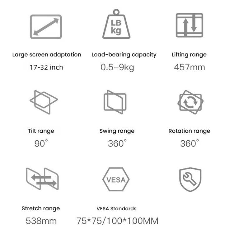 1. Dual-screen adaptation: supports 17-32-inch monitors, compatible with 75x75/100x100mm hole spacing